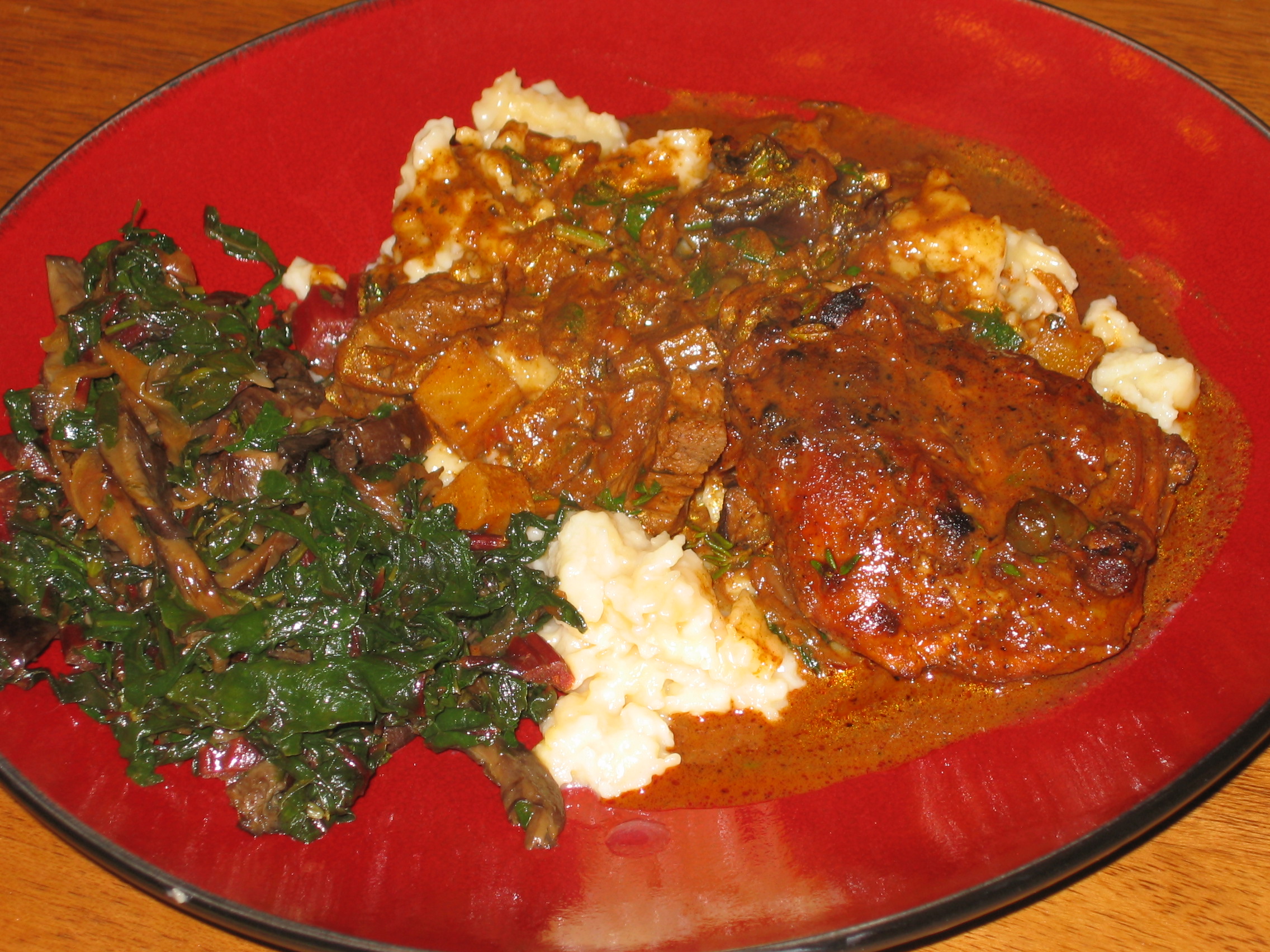 Once some good enriched broth is hanging out in your kitchen, what do you do with it? There is almost no pan-grilled or roasted meat that can’t be improved by a simple reduction sauce. Remove the meat from the pan, pour a cup of good broth into the pan over high heat, boil hard and scrape all the lovely browned bits into the broth, and when it’s reduced to a few tablespoons and has a syrupy consistency, swirl in a tablespoon of butter and serve immediately. A glug of good red or white wine, depending on the meat and seasoning, can be added to the pan for the initial deglazing, then add the stock and boil down. If you want to get fancier, most of the sauces of classic French Cuisine are at your command when you have really good broth to start with, and you can check out Glorious French Food or another cookbook to consider your options. Grains like rice and bulgur are delicious when ccoked in broth. If you’re a fan of Mexican cooking, you’ll want to try Zarela Martinez’s trick of toasting dried chiles of various kinds and then soaking them in broth rather than water before grinding them into a mole’ paste or other flavoring paste. Great stews like coq au vin are within your reach, although they will use up a lot of broth, which is why you make a lot in the first place. A paprikash like the one above requires little more than a meaty main ingredient, top-notch paprika, and really good broth (my own far-from-conventional recipe is below.)When I’m feeling dispirited and glum I revert to my Louisiana roots and make gumbo, and it invariably cheers me up, and usually cheers some other people too.
