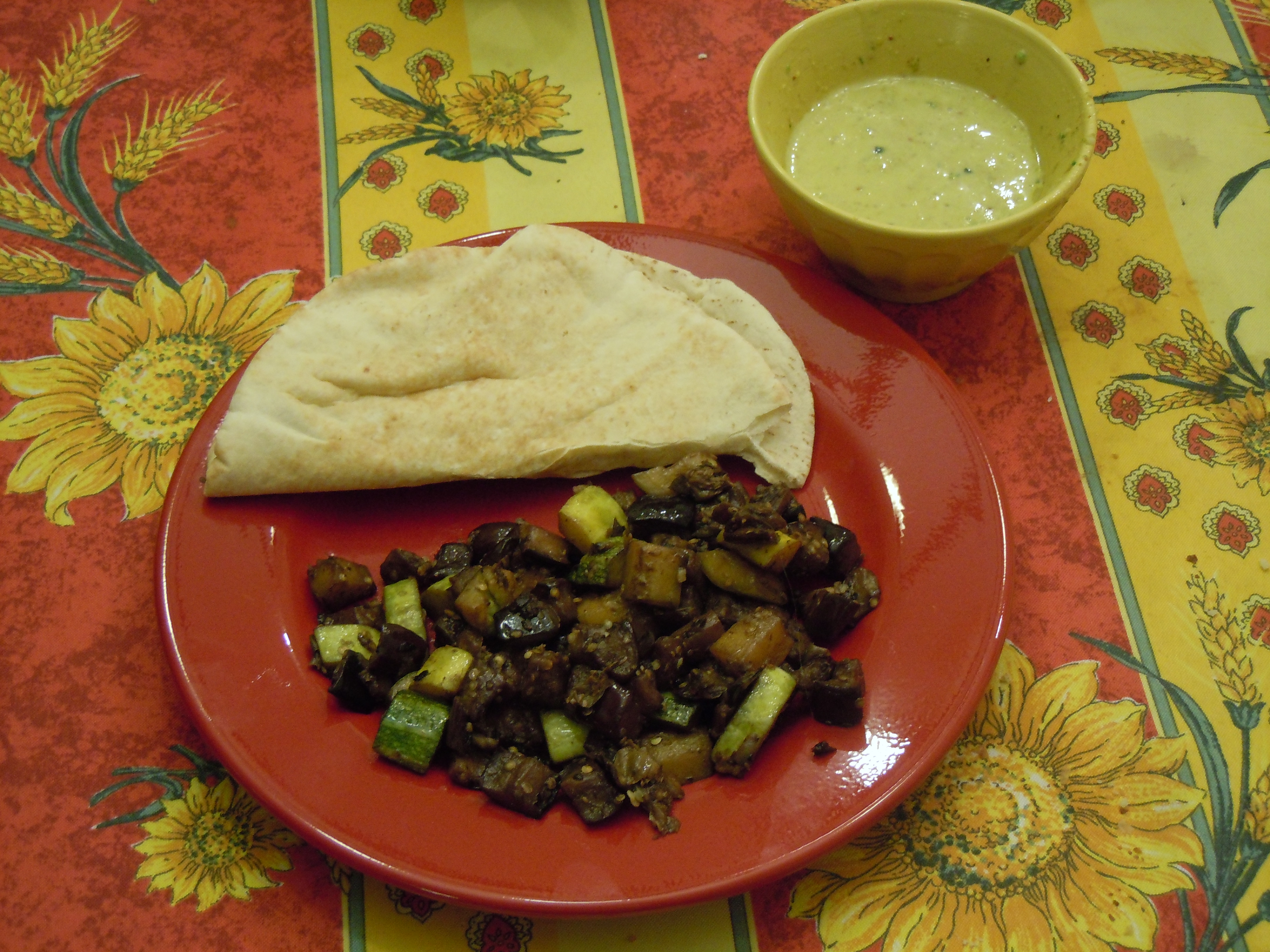 Summer vegetables are at their peak now, and in my home most of our meals are based on them. Mixtures that can be wrapped in a pita make a light easy meal on hot days. The filling can be made ahead, and keeps a few days in the refrigerator. OIl-cured black olives are used to add a meaty savor to eggplant and zucchini, and capers add an herbal note. This meal is vegetarian, and can be made vegan if you alter the sauce recipe a little.