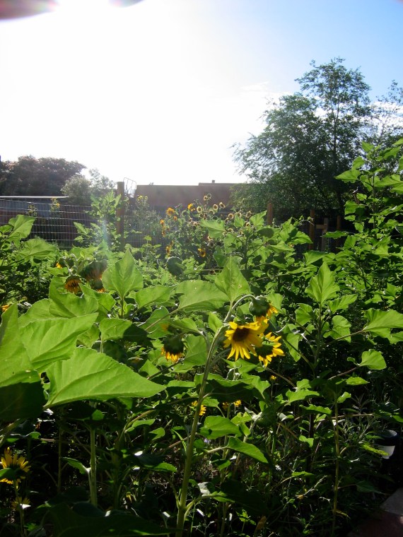 At the time that my dog was diagnosed there were hundreds of wild sunflower seedlings all around the property, and I decided to let them grow unmolested, thinking that they would eventually supply green matter for mulch and would keep worse weeds from taking over. We now have a sunflower forest twelve feet high on two sides of the house, and the beauty of the flowers lights up the days. They also attract thousands of bees to the open flowers, and the ripening seeds have drawn hundreds of goldfinches to my yard. Hummingbirds strafe each other over my head, and my husky spends his good days wandering in his own private jungle.