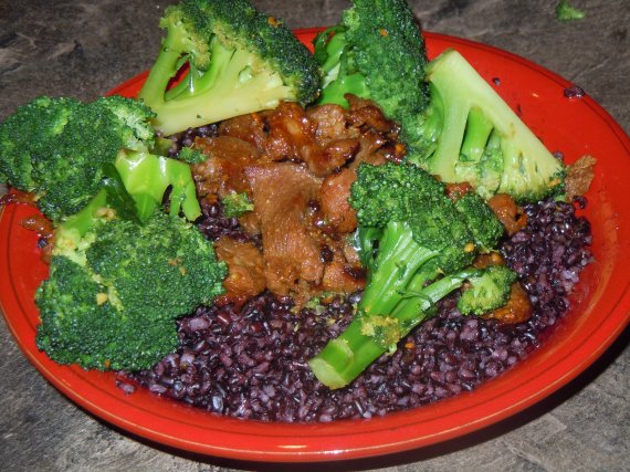 Grains: I like to have coarse bulgur, size 2, on hand because it cooks up with a more interesting texture than the finer grades that “gourmet” groceries tend to sell. Local readers here in Albuquerque can get it at Cafe’ Istanbul. Elsewhere, check your local Middle Eastern food source. I keep organic jasmine rice on hand at all times for Thai-influenced meals. I have never been able to take to brown rice, so I use white. I do love to use forbidden rice (black rice) on occasion. As you see above, it makes a dramatic deep-purple backdrop for bright green vegetables. I keep yellow, blue, and purple cornmeal. For baking, I always have coconut flour on hand to supplement white-flour products with a dose of fiber that doesn’t ruin the flavor. It’s tricky to work with at first, but as you learn its quirks it becomes easy to add fiber to your baked goods to improve the glycemic index. Coconut flour doesn’t ruin the color the way grain brans do.
