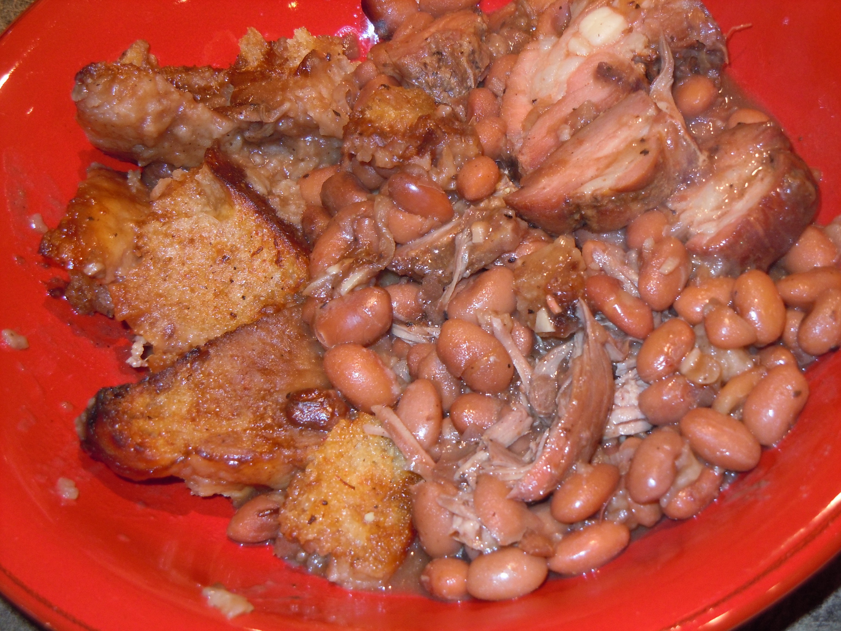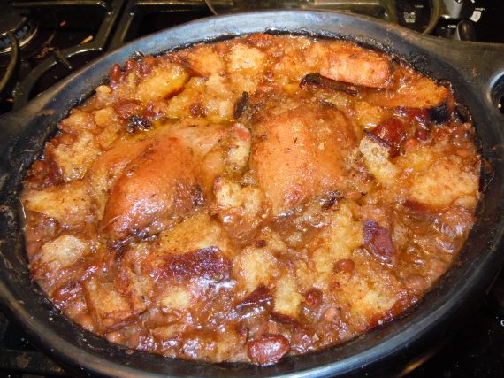 Preheat your oven to 350 degrees. While the beans soften to perfection, or reheat if cooked the day before, chop the onions and garlic finely. I do all the cooking in the big La Chamba clay casserole in which I will finish the dish, largely because it’s a thing of beauty and I love to handle it. You can use a skillet if your casserole won’t take direct heat. Heat the olive oil over medium heat, saute the onions until they are becoming transparent, add the garlic, and saute until thoroughly cooked and maybe coloring a little (I like the richness of flavor this adds, but don’t burn them.) Drain the beans, saving the broth for something else, and mix with the onions and garlic. Add the chopped thyme and 1.5 to 2 teaspoons of freshly ground black pepper (very important to the final flavor.) Taste the beans and make sure they are salted to the level that you want. Now stick the meat into the beans. If you are using raw sausage or any raw pork, keep it near the top. I used some sections of smoked spareribs and stuck them well down into the pot. I always plop a leg of duck confit on the top. If you’re using duck make sure the skin is a little above the beans to that it can get nice and crisp. Pour a cup and a half of rich hot stock over all, and save the rest of the stock in case you need it later. Stick the dish into the preheated oven for an hour, then carefully haul it out and poke around a little. Since everything was hot when you started, any sausage or pieces of raw pork should be cooked at this point, but if not, keep them on top where you can fish them out for extra cooking if needed. Make sure there is some fluid near the bottom, and add more stock if the beans seem too dry. If you want a gratineed top, as I always do, cover the top with breadcrumbs or little pieces of bread, making sure not to cover the duck skin if you’re using it. Stir the bready stuff lightly into any fat that has appeared on the surface so that it gets deliciously golden and crisp rather than hard. If there is no surface fat, dot the bread generously with butter or drizzle it with olive oil. Bake another half hour. Take it out again, and check the sausage to make sure it got cooked. If the top hasn’t gotten crisp and gold, run it under the broiler until it is, but make sure not to burn it. Serve, making sure that everyone gets some of the crisp bready bits on top, and a fragment of the duck skin if they want it. The taste of the dish is simple and pure, and can waken ancestral memories of the farmhouse table. A green salad on the side is nice, but fussy vegetables are just not needed.