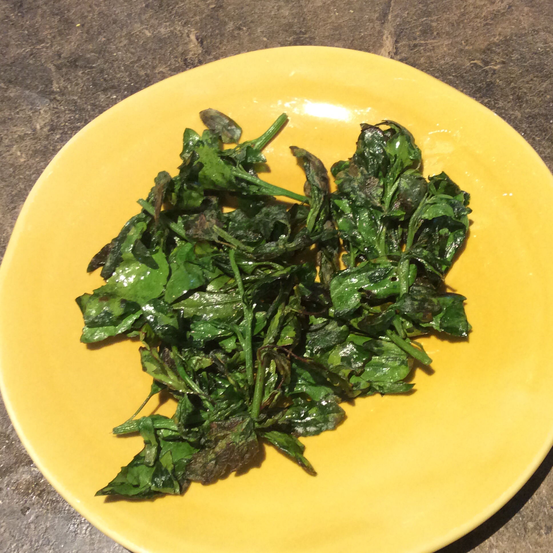 I was delighted with the results. I chose about a dozen small tender tips, maybe three inches long on average, and washed them but didn’t make any special effort to dry them beyond setting them on a towel to drain.  While washing them, I set my little 7 inch skillet over medium high heat to heat up. When the pan was hot, and my greens were washed and drained, I put in a glug of good olive oil. I never measure olive oil, but I would guess that the glug that looks right in my small skillet is about 2 tablespoons. You do need enough oil in the pan for the greens to be able to fry in spots. Wearing an apron and standing back a bit from the stove, I threw the greens into the skillet. They spat and hissed ferociously. After a minute, I sprinkled on a generous pinch of salt and turned them roughly. After another minute I turned the heat down to medium and continued to turn them over every minute or two until the stems were tender enough to eat and many ( but not all) of the leaves were browned and crisp. I turned them out onto a small plate, sprinkled on a bit of Fleur de Sel, and ate them hot in between other kitchen tasks. Yum. The flavor is fuller and maybe slightly more bitter than mild lambs-quarters can usually reach, and the crisped leaves crunch delicately between your teeth, like very thin ice.