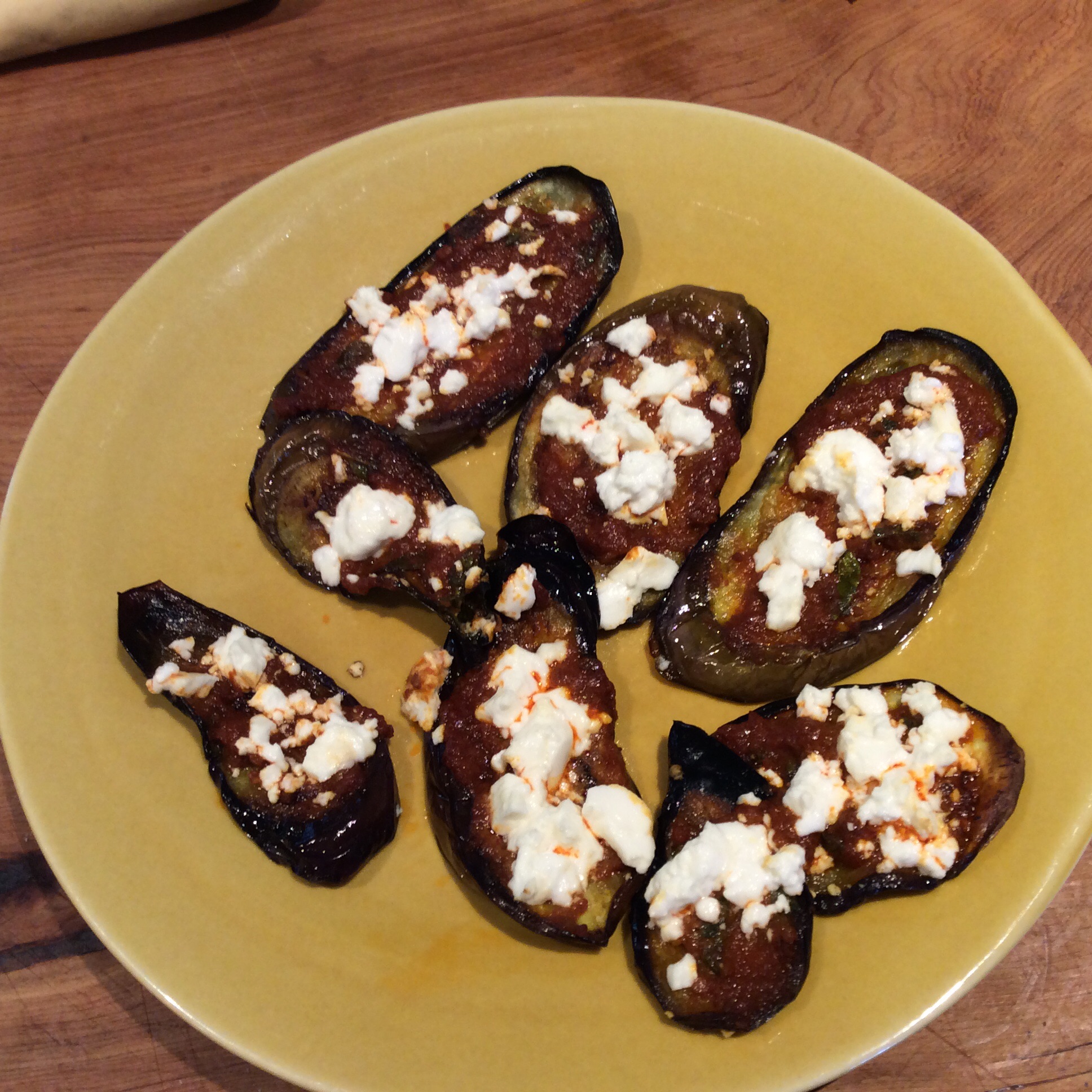 One evening recently I found myself with four expected for dinner and two Japanese eggplants. I decided to use the eggplants as an hors d’oeuvre and sliced them diagonally (to increase the size of the slices) about 1/3 inch thick, sprinkled the slices heavily with salt, and set them aside to disgorge while I rummaged in the pantry and refrigerator. I came across my tub of salt-cured capers and set a large handful of them aside to soak. I found some leftover marinara sauce, about a cup’s worth, and put it in a little saucepan and reduced it to half a cup to thicken the sauce and intensify the flavors. I added a small handful of chopped fresh Greek oregano, and since the flavor was going to lean more Greek I threw in a few chopped fennel fronds too, a tablespoonful or so. I pulled a slice of feta out of the tub in my refrigerator and crumbled it. The oven was turned to 425 to preheat.