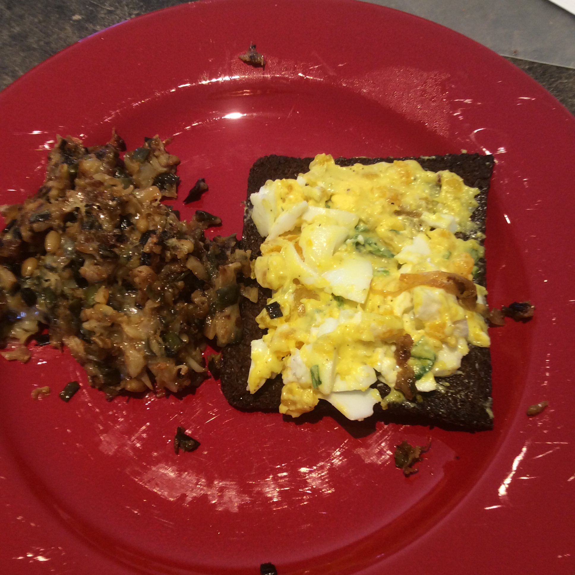 My last post was about a low-carb version of the classic peasant dish colcannon, and I suggested making plenty because there are lots of uses for it. Today I was surfeited with delicacy and wanted a punchier flavor. Easy. I threw a pint of leftover colcannon (intended to serve two) in a skillet with a bit of bacon grease and a chopped canned chipotle chile in adobo, seeds pulled out, a spoonful of the adobo added too. I fried this mixture over medium heat, going for some browning. The vegetables in the colcannon will brown easily because of the milk proteins in the butter and cream that you used when you originally cooked it. When as brown as you like, throw in a handful of grated cheddar, stir another half minute until the cheese softens, and serve with plenty of ground black pepper on top. I needed a very filling meal, so added a quick egg salad with sliced hard-boiled eggs, homemade olive oil mayonnaise and fresh chopped tarragon (just up this week!) on a slice of flaxseed bread. If I had been less hungry, I would just have sliced half an avocado alongside.