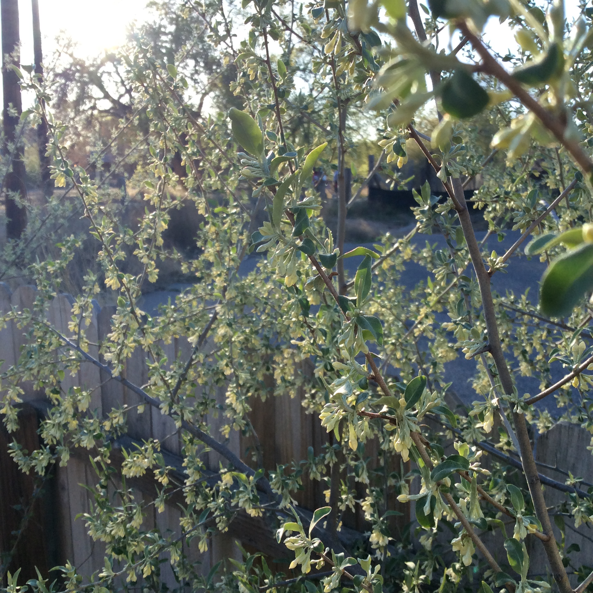 A few years ago I began a project to grow fruits that offered maximum antioxidants with minimum carbohydrates, in other words fruits very different from the swollen sugar-pops that fill the American grocery store. I had been reading with great interest about Goumi berries because genus Eleagnus thrives in my area with relatively little water. I planted three of them, and over the next two years they got a bit bigger but nothing much happened. Last year, their third year, they grew over 5 feet tall and one produced three tiny berries. Hardly an exciting outcome. But this year they have already earned their place; all three are covered with scads of small discreet blossoms and when the sun hits them, the scent that they throw all over my front yard is indescribable. It has the honeyed spicy sweetness that characterizes Russian olives in bloom, but without the grape Koolaid note. Utterly delicious. They are humming with bees, and I do wonder what Goumi honey would taste like.