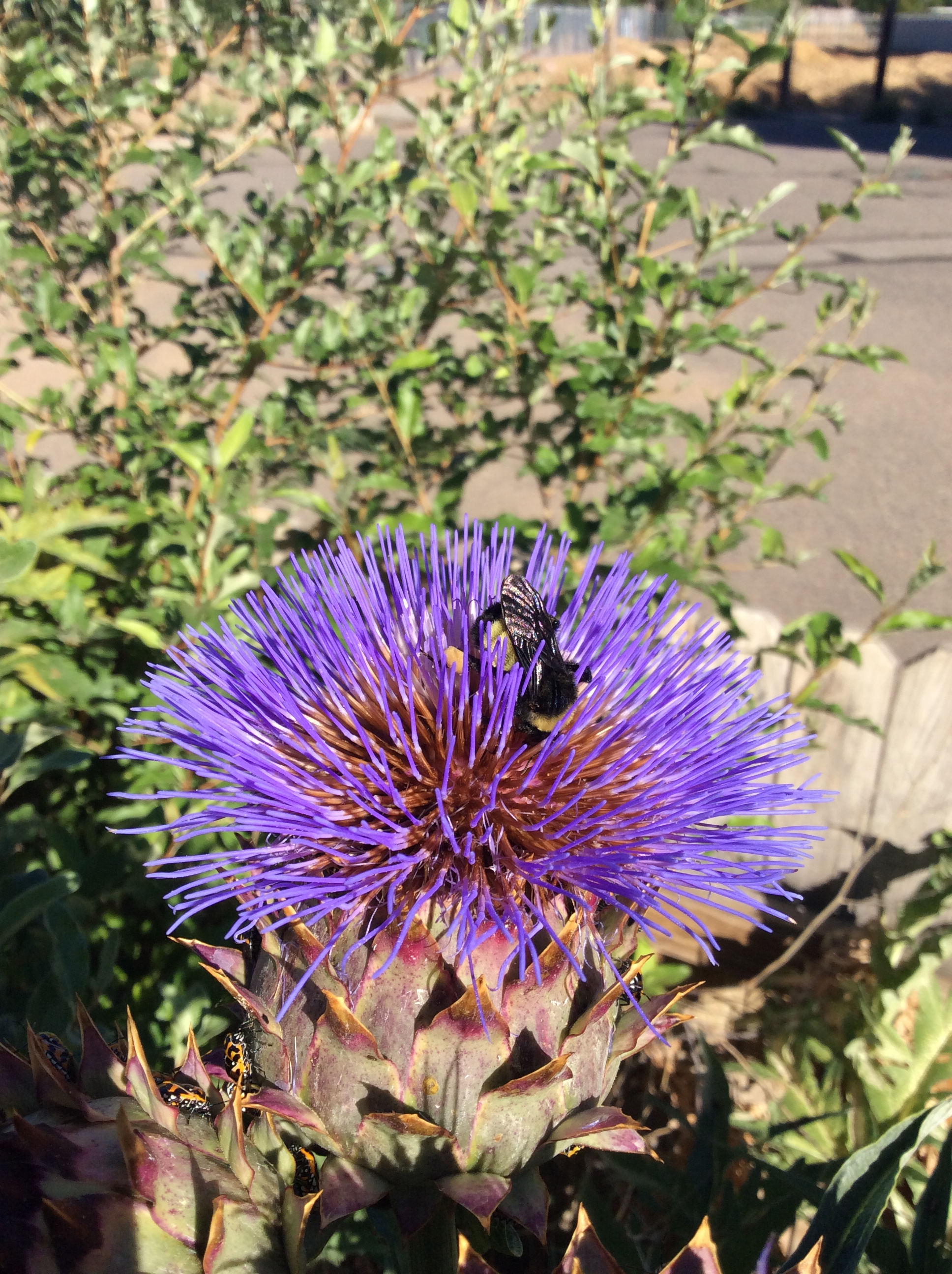 When I think about our country’s independence, I think about personal independence and how important food supply is to that. In maintaining a steady home food supply, one of the things you need is a steady supply of feed for your pollinators. I have been paying a lot of attention to trying to have a steady supply of nectary plants throughout the summer, and in our hot desert summer that can be difficult. Currently, the poppies are pretty much finished blooming, and I find that cardoons and artichokes are extraordinarily attractive to bees when allowed to flower.  I have a number of cardoon plants that grow beautifully in our hot summer and alkaline soil but have not turned out to be much good for eating; one day soon I will post on that depressing topic.  But the plants more than earn their keep by feeding my bees in fiery July.