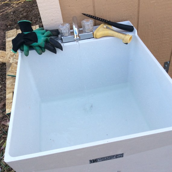And the garden goods could be washed and prepped right in the garden where the water could do some good. This is an ordinary laundry sink, but I asked the nice man at the plumbing supply store to sell me the correct fittings to hook a garden hose to it. So the water can be turned on and off, and the water drains out into a bed that can really use the moisture. My ingenious yard man got me a 3 foot piece of hose with the correct fittings to attach to the fawcet at one end and the hose at the other, so there is no fumbling underneath when I want to use the sink. And it could be lifted and moved if I wanted the water to land somewhere else.