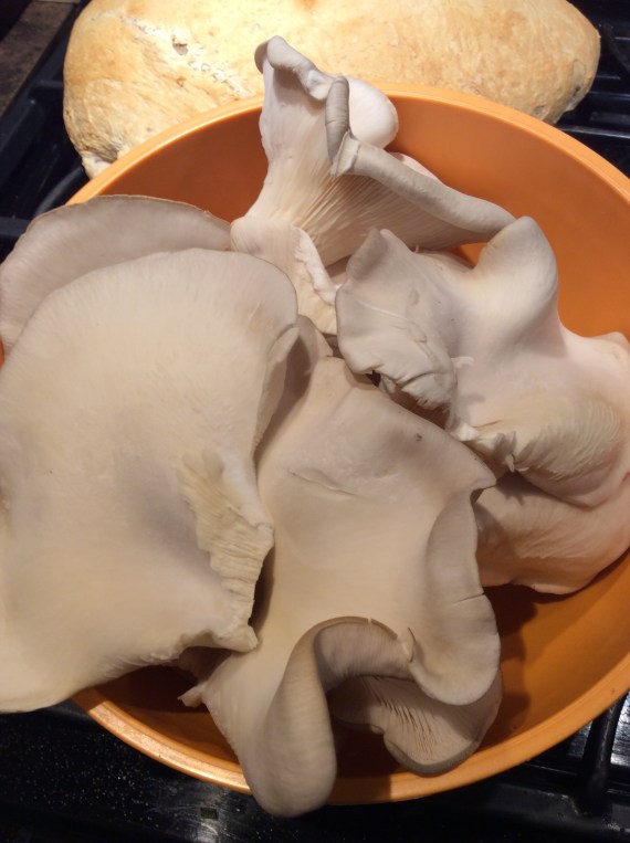 First, I went to the shed to get a tool, and my latest mushroom laundry basket had a gorgeous huge clump of oysters across the top.