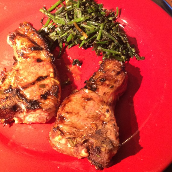 If you are dealing  with an old goat, this is certainly true, but I can’t imagine butchering an old goat. Goats under a year old are delicious, with a full robust flavor that people who shop at the supermarket can hardly imagine, but nothing that can fairly be described as gaminess. The ones that I occasionally produce for our household are 100% alfalfa-fed. If you are lucky enough to have access to such meat, cook it with respect. For the chops, that means marinating with garlic and herbs and grilling medium-rare because the meat gets tough if allowed to dry out. If you can’t get young grass-fed goat, apply the same principles to lamb chops, another meat that has not yet had the flavor bred out of it. Sear on the grill to medium-rare, let rest in a 200 degree oven for 10 minutes, and serve with a veggie that works with robust flavors, such as the pan-grilled hops shoots shown here.