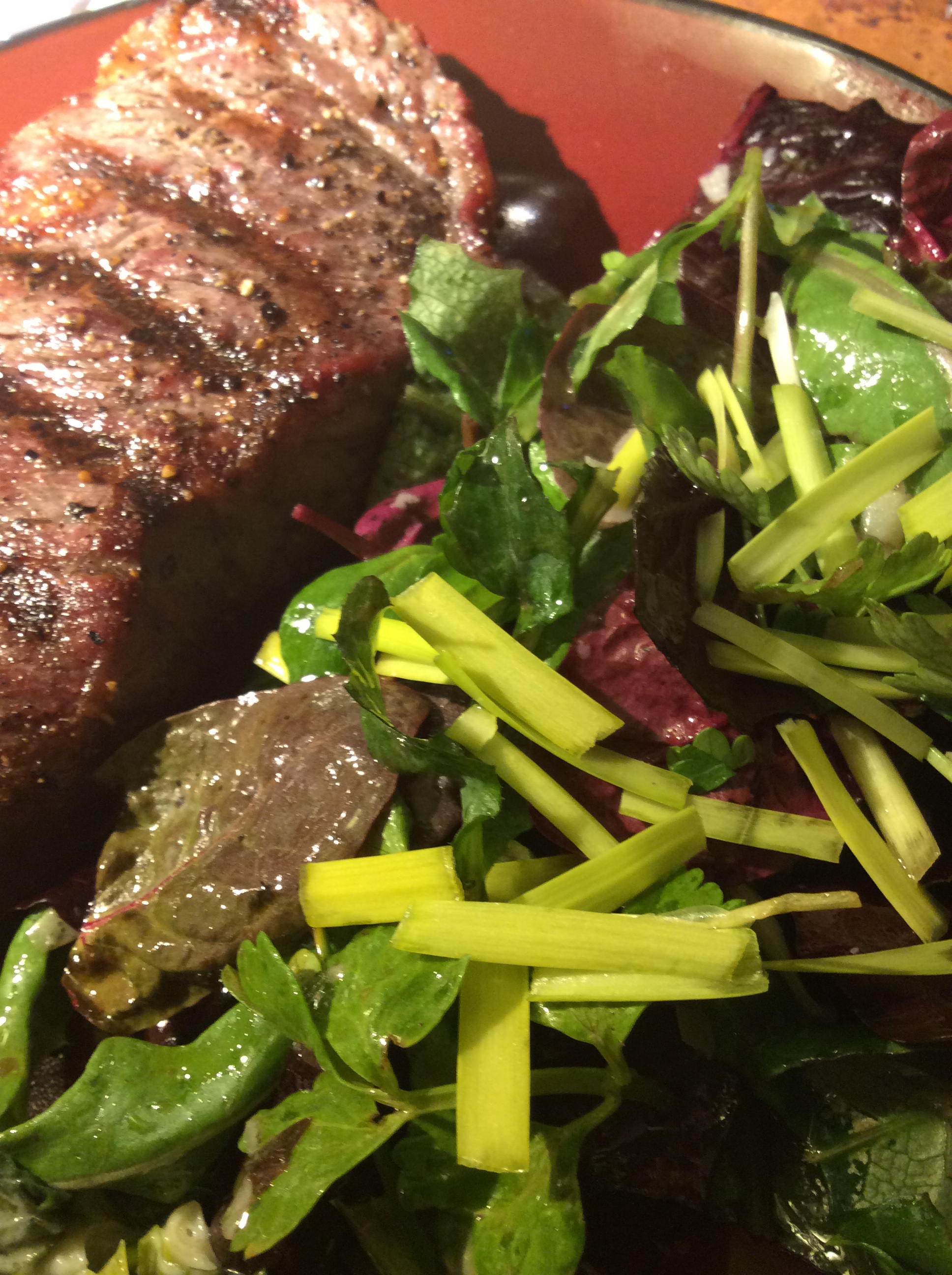 I don’t often go in for blanching because, in general, I do want my produce  kissed by the sun and full of all the nutrients possible. However, when I saw my two clumps of garlic chives coming up, I decided to try blanching one of them. There are some elegant ways to accomplish this, but I did it very inelegantly.  I hauled my big stockpot out to the garden, turned it upside down over one of the clumps, and set a rock on top.  This worked perfectly. About six days later I remembered to look underneath, and there were long chartreuse strands. I tasted one, and it had a mild and sweet garlic flavor, perfect for eating raw.  I picked them all, and have left the clump to see if it will rejuvenate.