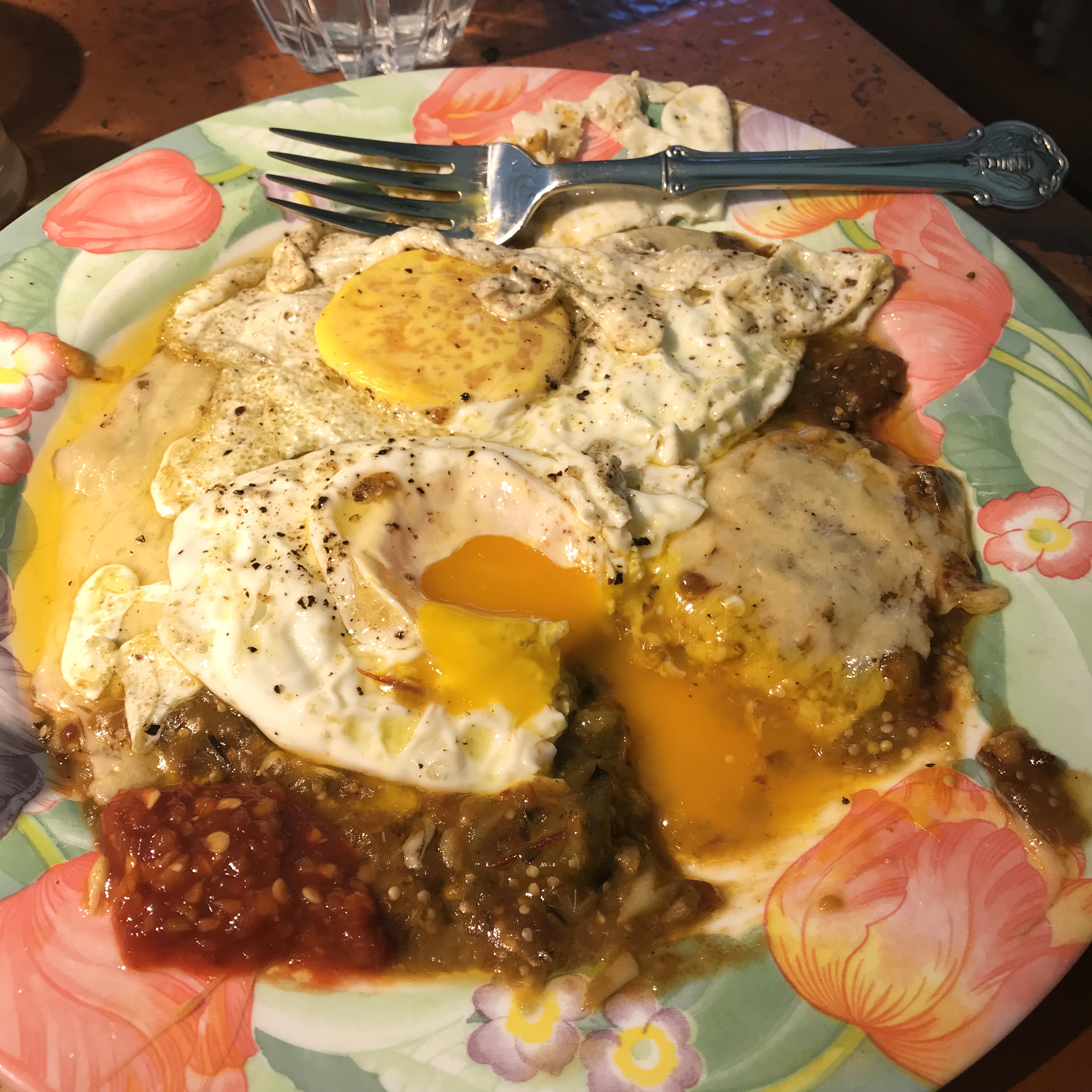 Somehow, nothing looks as naked and unappetizing as a lonely egg on a plate. A lovely piece of buttered sourdough toast rounds out the picture nicely, but is off limits if you control your blood sugar by eating low carb. There are lots of potential solutions to the lonely egg problem, but one of my favorites is to put the eggs on a base of gratineed salsa and cheese, a sort of deconstructed queso fundido. The concept couldn’t be simpler. Preheat the broiler. Make mounds of thick salsa on a well-greased baking sheet, one per diner, spaced two inches apart each way.  Cover each mound with a generous heap of grated grass-fed cheddar. Cook under the broiler until the cheese is melted. Using a lightly oiled spatula, finagle each mound onto a plate, and put one or two fried eggs or a small heap of scrambled eggs on top.