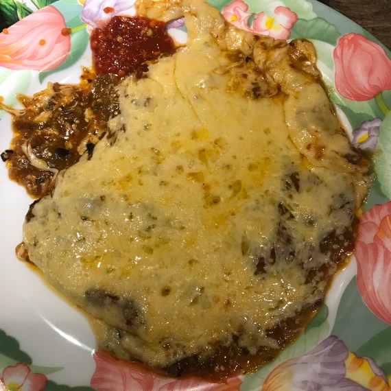 If you wish to elaborate further, you can drizzle avocado oil on top and run under the broiler again for a second as you see in the top picture, but it isn’t strictly necessary. I like a spoonful of hot red chile on the side. Serve. The low-carb eaters have a glorious gooey flavorful mess, and the carb eaters can be provided with tortillas.