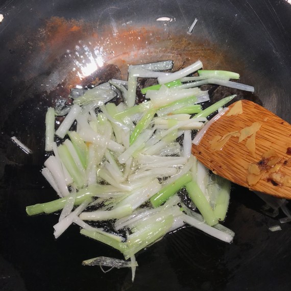 If you have perennial green onions you will have them forever, and they spread so efficiently that they become quite a weed in time. For this dish I pulled four very large fat green onions, cleaned them, and cut them in 2” lengths, then cut each chunk in fine lengthwise slivers, keeping the white parts and green parts in two separate piles. If you’re using commercial scallions, 8-10 of them is probably equivalent.