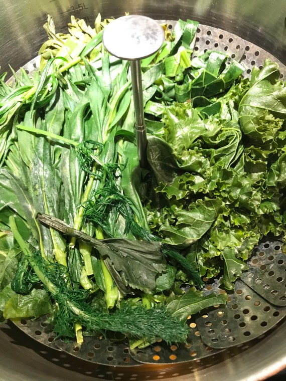 The greens were a handful each of a lot of things growing around the yard: two chard leaves with stems sliced, a collard leaf sliced into threads, scorzonera leaves sliced crossways, bladder campion stems, the tender tips of goji berry shoots, small fennel leaves, a few tarragon tips, and several leaves of young curly kale. All were steamed for about 4 minutes and then allowed to cool to room temperature. Cooked white rice was brought to room temperature.