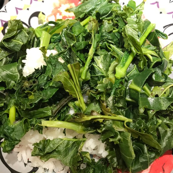 The greens were chopped into pieces about an inch long, mixed up, and layered on top of the rice.