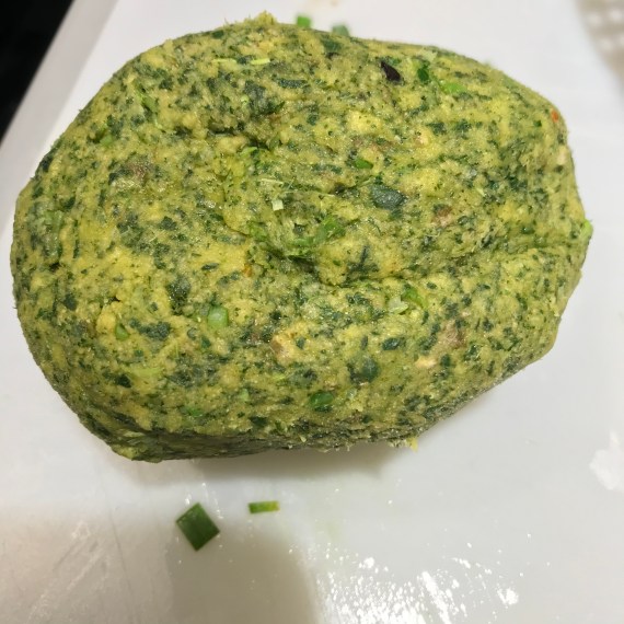 I was just playing around in the yard, so all measurements given here are inexact. This makes two servings. I gathered a double handful of tree leaves, mostly young Siberian elm tips but also a small fig leaf, a very large grape leaf, and some young mulberry leaves. Fresh pasta only cooks for a minute or two, so I precooked the leaves in the steamer for seven minutes at fairly high heat. Once they were steamed, I turned them out on a cutting board and chopped them roughly with a knife. Then I put a heaping cup of flour in the food processor, added the leaves, and ran the machine until the leaves were chopped as finely as possible. Then I added egg yolks one at a time until the dough formed. For me, this took five yolks. It might be more or less depending on your ambient humidity and your flour. At this point I had a smooth, slightly sticky lump of dough.