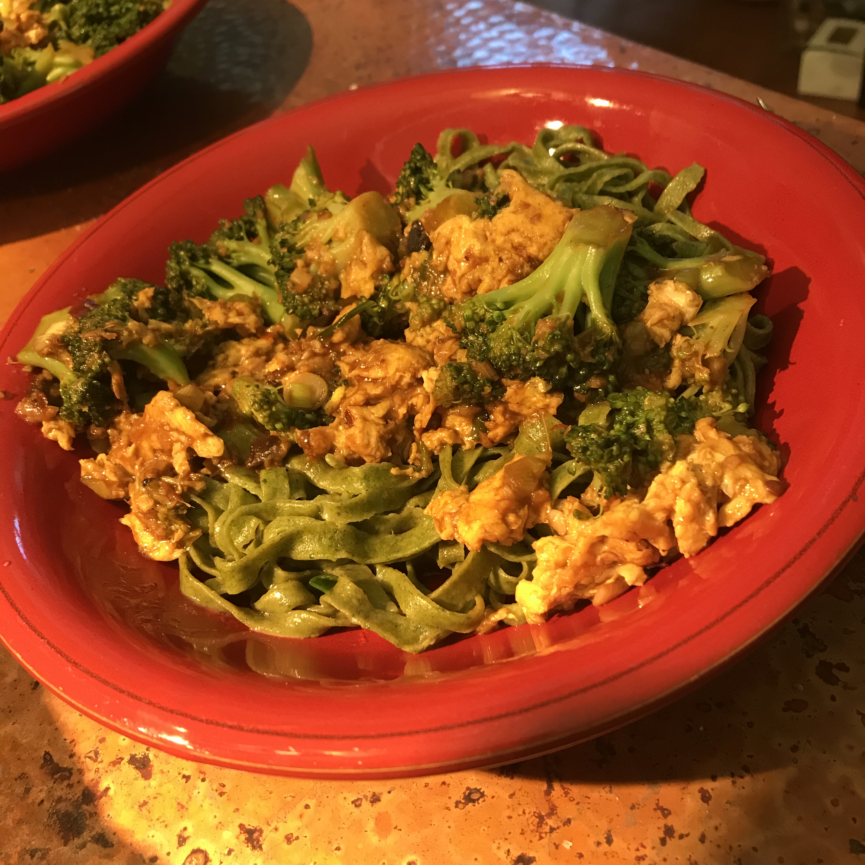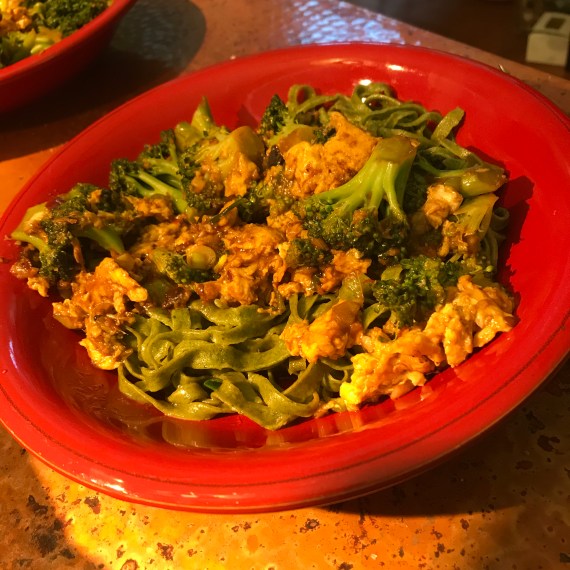 A pot of salted water is brought to a boil and the noodles boiled just until barely done, less than a minute in the case of this delicate green fresh dough. Drain the noodles quickly, return to the pot, sprinkle lavishly with soy sauce and at least 2 tablespoons of Asian sesame oil, and toss around a little to keep the noodles from sticking to each other. Set aside, covered. Now quickly, heat your wok over highest heat, put in some cooking oil of your choice, sauté the chopped garlic and ginger for several seconds until the pieces start to look opaque and the fragrance comes up, add the scallions, chile paste, and oyster sauce, throw in the steamed broccoli florettes, and stirfry for a few minutes until done to your taste. Stir the “juice” quickly because the cornstarch settles to the bottom. Toss in the scrambled eggs and the “juice“ and boil hard for another half a minute until it thickens. Divide the noodles into four bowls, or into two bowls and a container for the refrigerator, put the broccoli mixture on top, drizzle with a little more soy sauce and sesame oil, and relish your double layers of vegetables, triple layers if you count the greens that the hens ate.