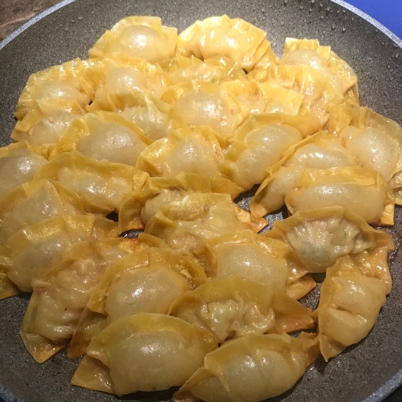 To cook, place them closely in a nonstick skillet that has a lid and pour in just enough water to make a film on the bottom, usually about a third of a cup. Add a tablespoon of soy sauce and 2-3 tablespoons of your chosen cooking oil. Put the skillet over medium heat until the water is sizzling, put the lid on it, and cook a few minutes, checking frequently, until the dumplings are cooked and puffed as shown.