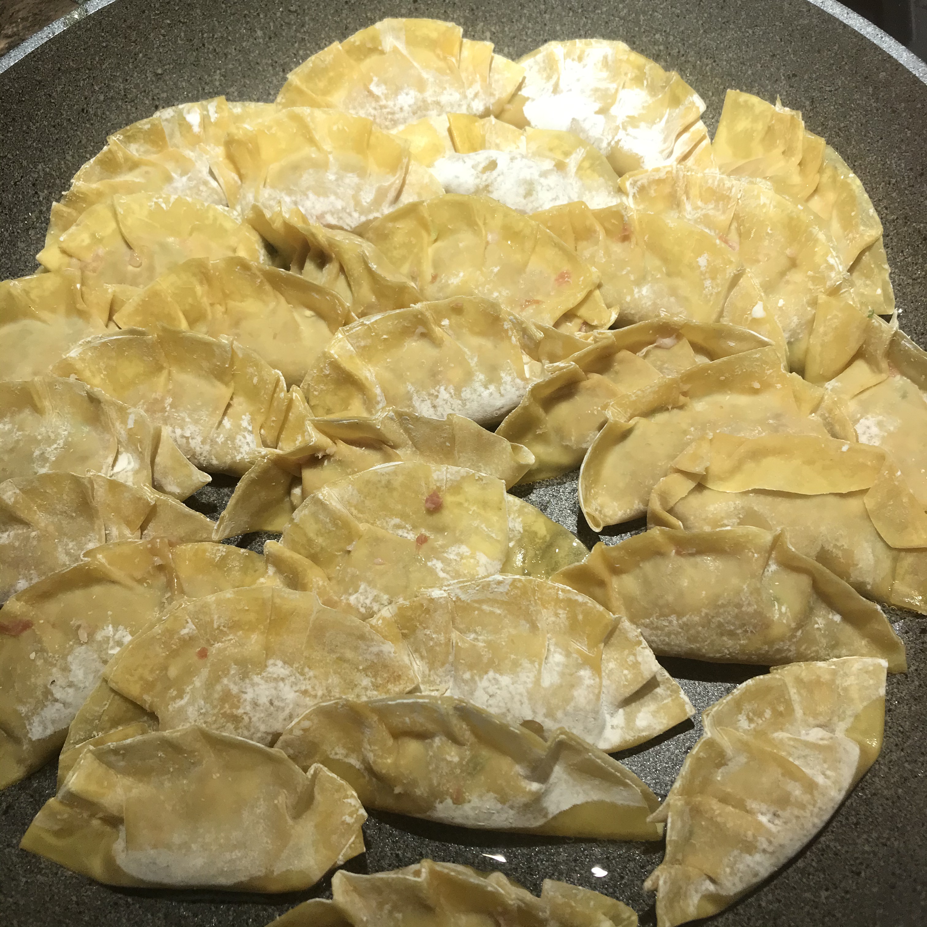 Potstickers are very easy if you use purchased wrappers. The filling is pretty adaptable and there are scads of recipes online if you feel that you need one. My basic formula is half a pound of ground meat, half a teaspoon of salt, a tablespoon of soy sauce, a 1”by2” piece of peeled ginger chopped finely, and the white parts of four scallions chopped into pieces about the size of coarse crumbs. Mix together and elaborate a little if you like to do that. Personally, I always want a texture ingredient. I used to use fresh water chestnuts when I lived where I could get them, but I don’t like the canned ones, so I used some jicama chopped into little pieces about the same size as the scallions.