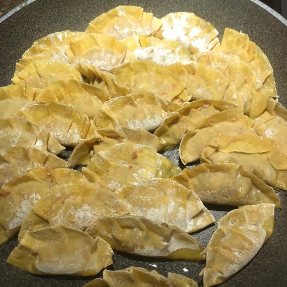 Lay out a few wrappers at a time, keeping the rest under a damp towel. Put about a teaspoon full of filling in the middle, dip your finger in a cup of water and run it around the inside edge of the wrapper, bring the two halves together, and make little pleats. As you see below, mine are not very neatly pleated, and probably a fastidious Chinese cook would be appalled, but they taste fine. This is a good kitchen task for older children, and can be done sitting meditatively at the kitchen table.