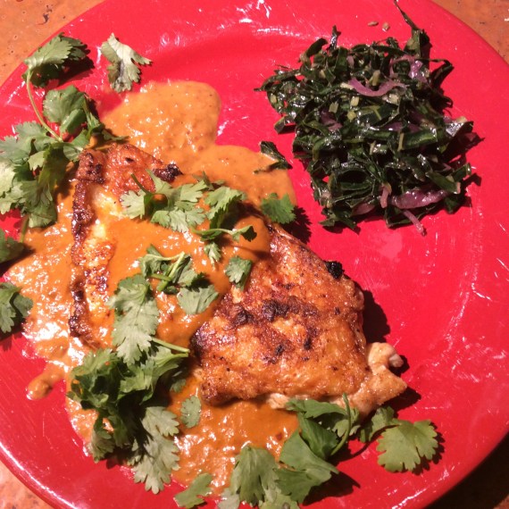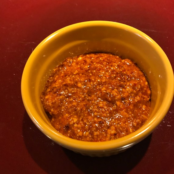 Peel the cooked garlic cloves, add them, and process to the fine-crumb stage. Sprinkle in the teaspoon of vinegar and add olive oil to taste. I add the oil a tablespoon or two at a time, processing briefly between additions, and add only enough to coat the “crumbs” and bring the salsa together. Many commercial versions are swimming in oil, which doesn’t appeal to me, but suit yourself. Now taste and salt as needed. I can’t guess at a quantity because it depends how much salt was on your peanuts, but this is a condiment and in my opinion it should lean salty, to balance the heat.
