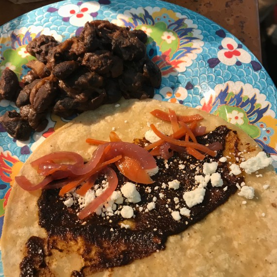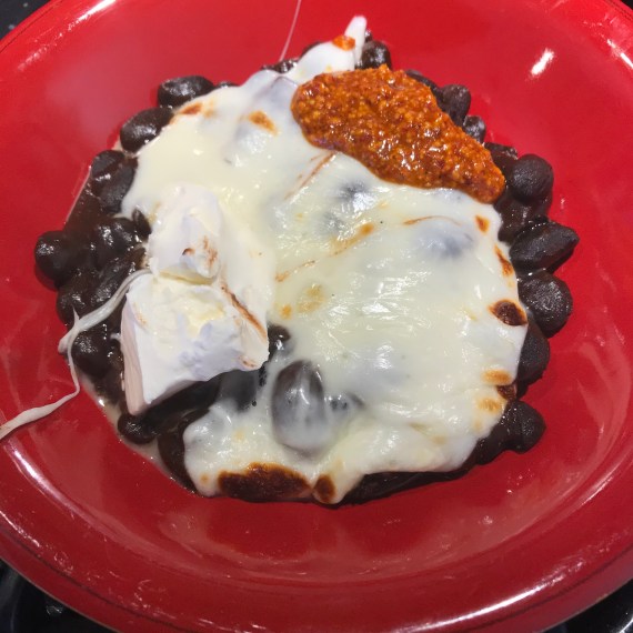 It’s great on a grilled tortilla as a snack or cook’s treat, and good as a table condiment with any dish that isn’t too delicate in flavor. I’ve enjoyed it with shrimp rubbed with chipotle and garlic and grilled. It would be good with simply cooked and salted earthy greens. Today I dished up simply cooked black beans from Rancho Gordo, grilled some asadero on top, and dolloped some creme fraiche and salsa macha on the side. Simple, filling, and interesting to eat.