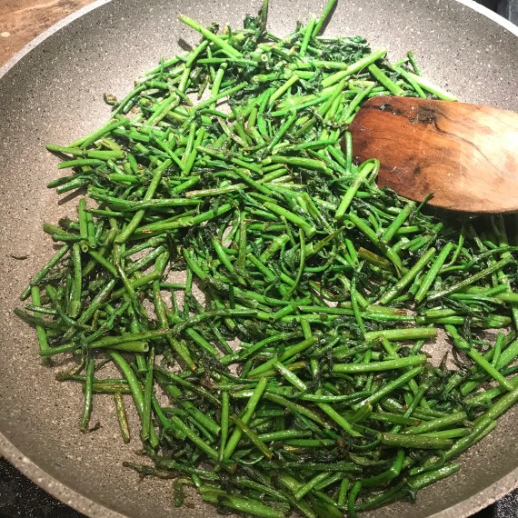 For flavoring, garlic is always a favorite of mine, and right now the garlic is forming bulbs but they are small and the skin is still young and tender. I pulled an entire head since they are mild this early, peeled off just the toughest outer layers, and sliced the rest finely in cross section and chopped it. The material that would later become the skins is full of allicin, and is very desirable. But I also wanted some herbal flavor, so I grabbed the top of one of my bronze fennel plants. At this time of year, when it is getting full and bushy, bronze fennel is so ornamental that I can hardly stand to use it, but it tastes good so I try to overcome my scruples.