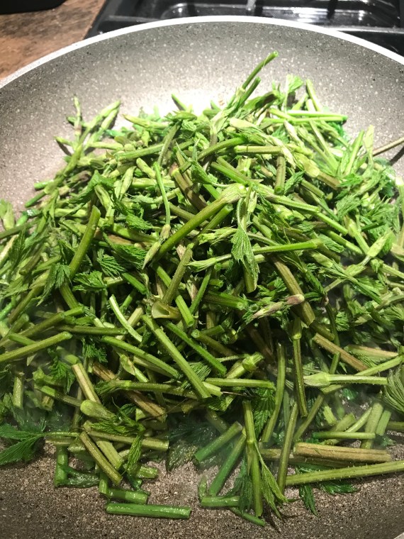 Today I decided to write about some uncommon greens which are unique to the season. Americans don’t think very much about eating the leaves of trees, but some of them are very appealing, and my favorite “tree green“ is the young sprouts of mulberry trees. It is almost never possible to gather good edible leaves from mature trees. The best mulberry greens are the tips of actively growing shoots from trees that have been cut back, and I am lucky because on the walking trail near the river in my area, several mulberry trees have been cut back to keep them from impinging on the trail. They produce a forest of new growth, and it is the tips of that new growth that are good to eat. Harvest only as far down as the stem can easily be snapped with your fingernail. If it bends or creases instead of snapping, go further up toward the tip.