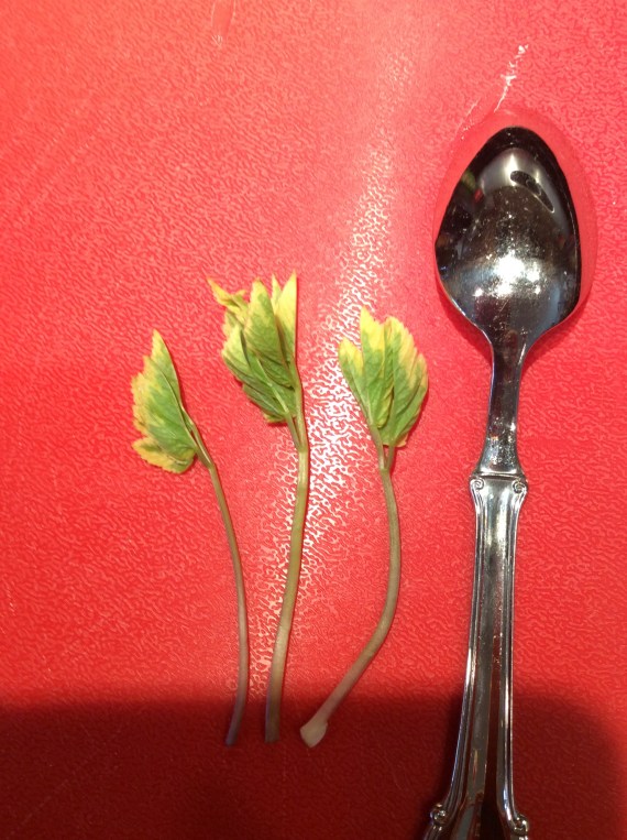 This photo has three of my favorites. To the right are perennial green onions, which I have written about so much that here I’ll just remind you to sliver some into salads. In the center are young shoots of bronze fennel. Later in the year I would chop them up, but at this stage they’re so mild that I just cut each small leaf in 2-3 pieces. To the left is the first spring growth of Angelica archangelica, which I haven’t used until this year. The first tender leaves of spring have strong notes of celery and juniper. I tear them into pieces about an inch across. When they start to get tough, the stems chopped in thin cross-section will give a similar effect.