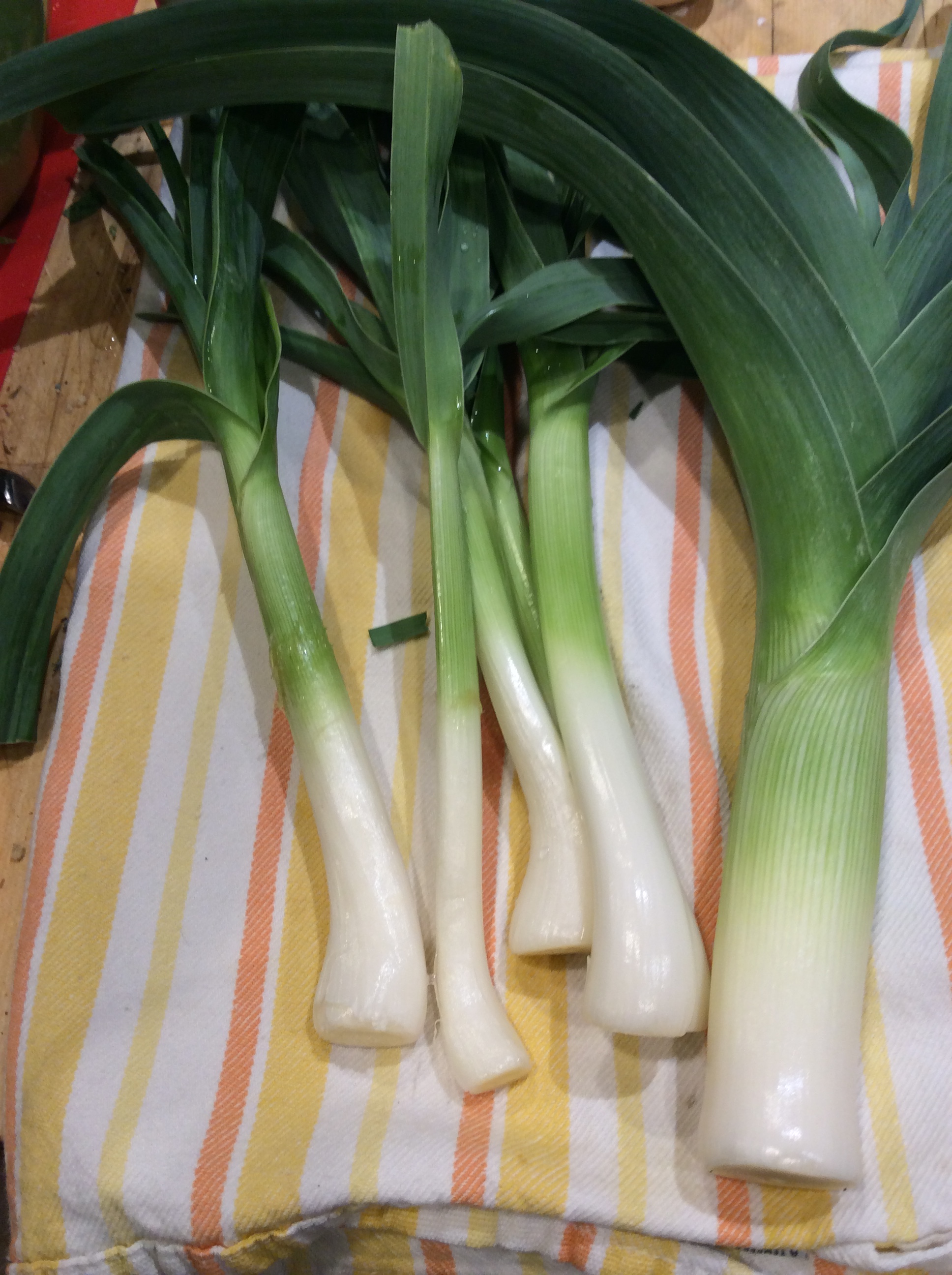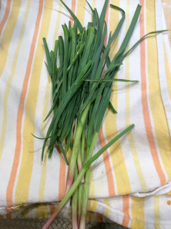 Every few years I permit myself to carry a bit about garden produce that is misunderstood. Judging from what I see at farmers markets, green garlic is misunderstood. Because here’s the important thing: green garlic is green. It is bright vibrant green and not yet yellow-green or beginning to yellow, and certainly does not show any garlic scape yet. If the scape has appeared, it is no longer high-quality green garlic, although soon the scape will become a tasty item. Green garlic is very delicious from the time the leaves first show up on the ground to the time that the leaves are large and developed and the stalk is elongating, but even the lowest leaves remain bright green and are not yellowing. For the most part, the white underground shaft will not show enlargement, but might be beginning to swell as you see in the five stalks on the right above. Peel off a couple of lower leaves, cut away the roots, and wash, and it is ready to use. The upper leaves are no longer of culinary interest, but by peeling them off you can get more tender stalk and still use most of the plant.