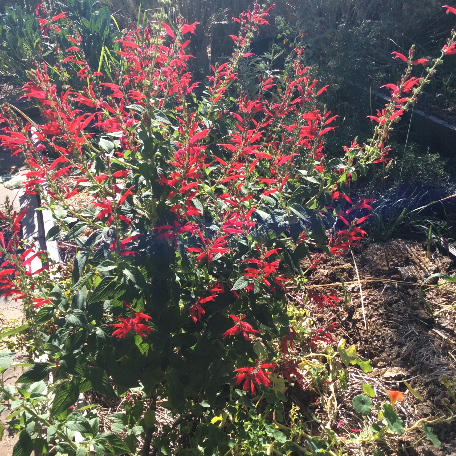 Speaking of attractive to bees, cardoon has become quite an invasive in my yard but one that, as you see above, has its admirers. I loved cardoons when I ate them in Italy, and brought back seeds from there to make sure that I got the edible kind and not the florist kind, but I have never been able to eat my homegrown cardoons. No matter how carefully blanched, they are inedibly bitter. They do provide one wonderful vegetable, the peeled top of the bloom scape before the buds swell, but that is one small serving per very large plant. I still let them seed themselves around though, because the bees and my goat adore them and even in my desert climate and alkaline soil, they come up in odd corners and require no care or attention whatsoever. The huge jagged silver leaves are strikingly ornamental. When they come up in the middle of garden beds, I let them reach a good size and then pull them for the goat. I have read that the large parsnip-like root is edible, but when grown in my yard it is as bitter as the leaves, and is a flavor that only a goat could love.