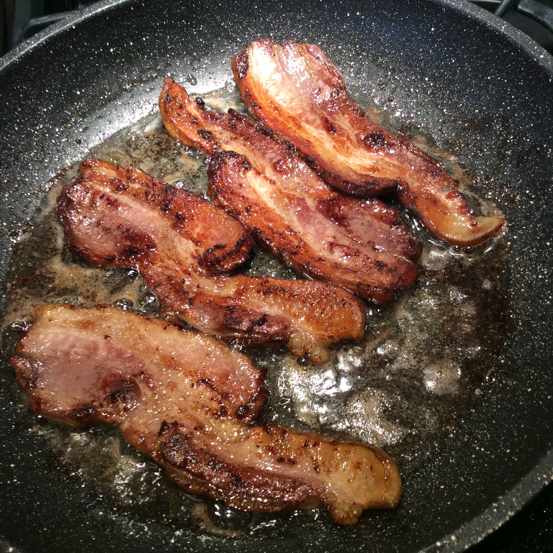 As it turns out, making bacon is child’s play. There are a lot of ways to approach the curing step, but I chose brine because it’s so simple. Dissolve a cup of salt in each gallon of cold water, and make enough gallons to cover the pork belly completely in a vessel that will fit in your refrigerator. If you want, you can buy curing salt that contains nitrates to preserve red color in the meat, but I don’t see much point in this when you are going to fry the meat brown anyway. Put a plate on top of the meat to keep it totally submerged, cover the vessel, and refrigerate for a week.