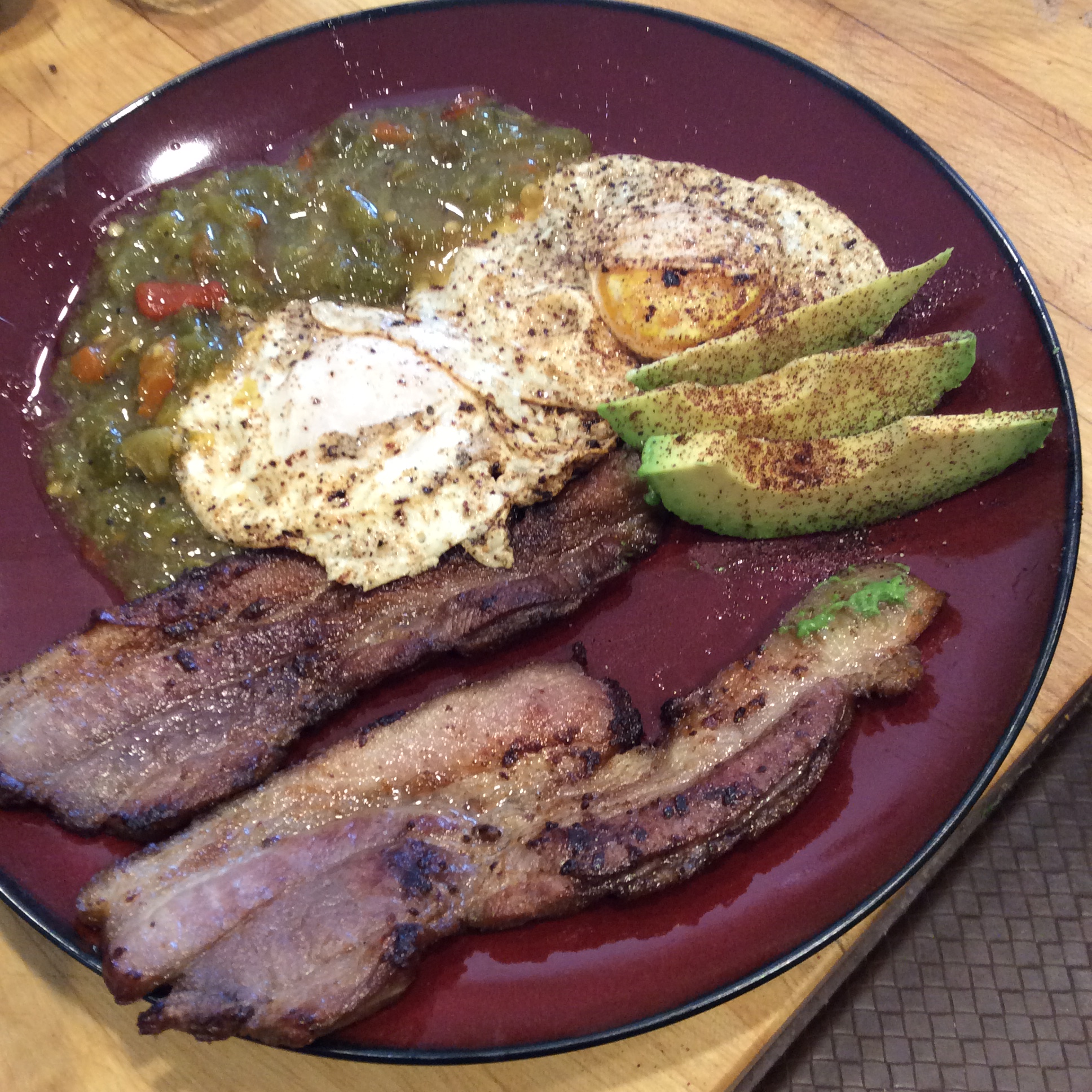 Our lunch today was generous slabs of real bacon, eggs from my hens fried in bacon fat, green chile, and a garnish of avocado sprinkled with chipotle. After a lunch like this, we are full until 8 or 9pm. A snack in the late evening is plenty. This is real food.