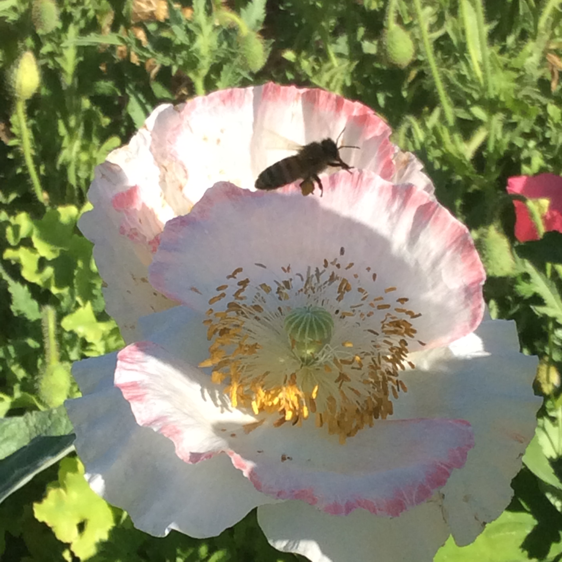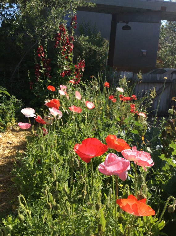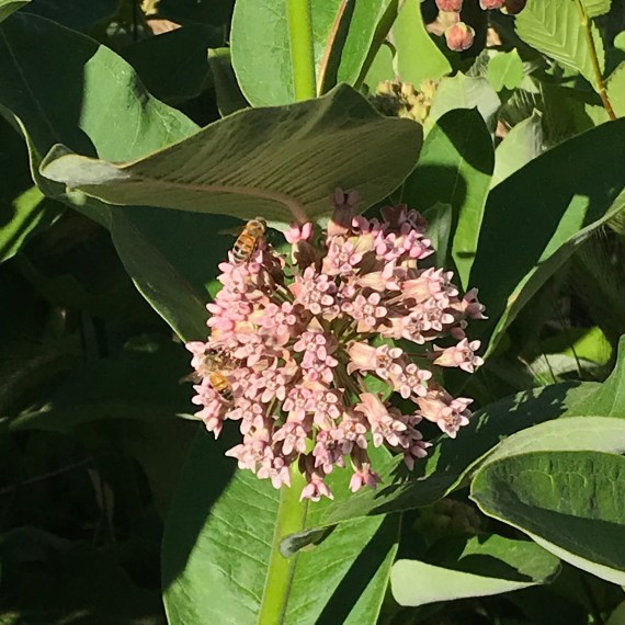 With that in mind, I began looking around my yard to see what all is available to my resident bumblebees and other pollinators right now. All the bees in my area seem to be quite mad for poppies, but the poppy season is drawing to a close. Still, there are lots of other things. Exhibit A, above, is milkweed. It has taken me four years to finally have a thriving blooming patch of milkweed, but the bees definitely appreciate it. The picture above shows honeybees, but the bumbles visit it regularly too. I haven’t seen any monarchs yet, but I remain hopeful.