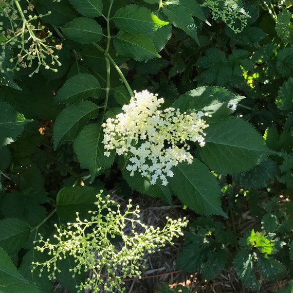 The elderberry bushes are in bloom and they seem to be attractive to all kinds of bees and other pollinators, as well as being attractive to me when in fruit.