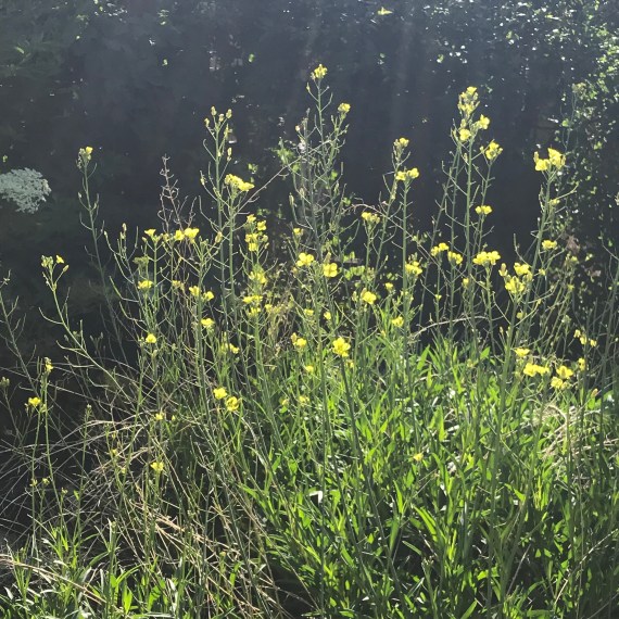 Next to milkweed, the most thronged plant in the yard right now is perennial arugula, which tends to bloom just after the annual arugula,shown below, finishes. Both are wildly attractive to bees. The honeybees can light on the slender stalks without too much trouble, but when a bumblebee lands on them, they bend over double. Interestingly, this does not seem to deter the bumbles. They just sort of ride the stalk down and mine the flower of pollen while hanging upside down. These are cruciferous plants, and I have noticed that when collards, kale, or broccoli are allowed to go to flower, the bees are crazy about them too. I am not sure what makes crucifers so attractive to bees. But there is no arguing with the fact.