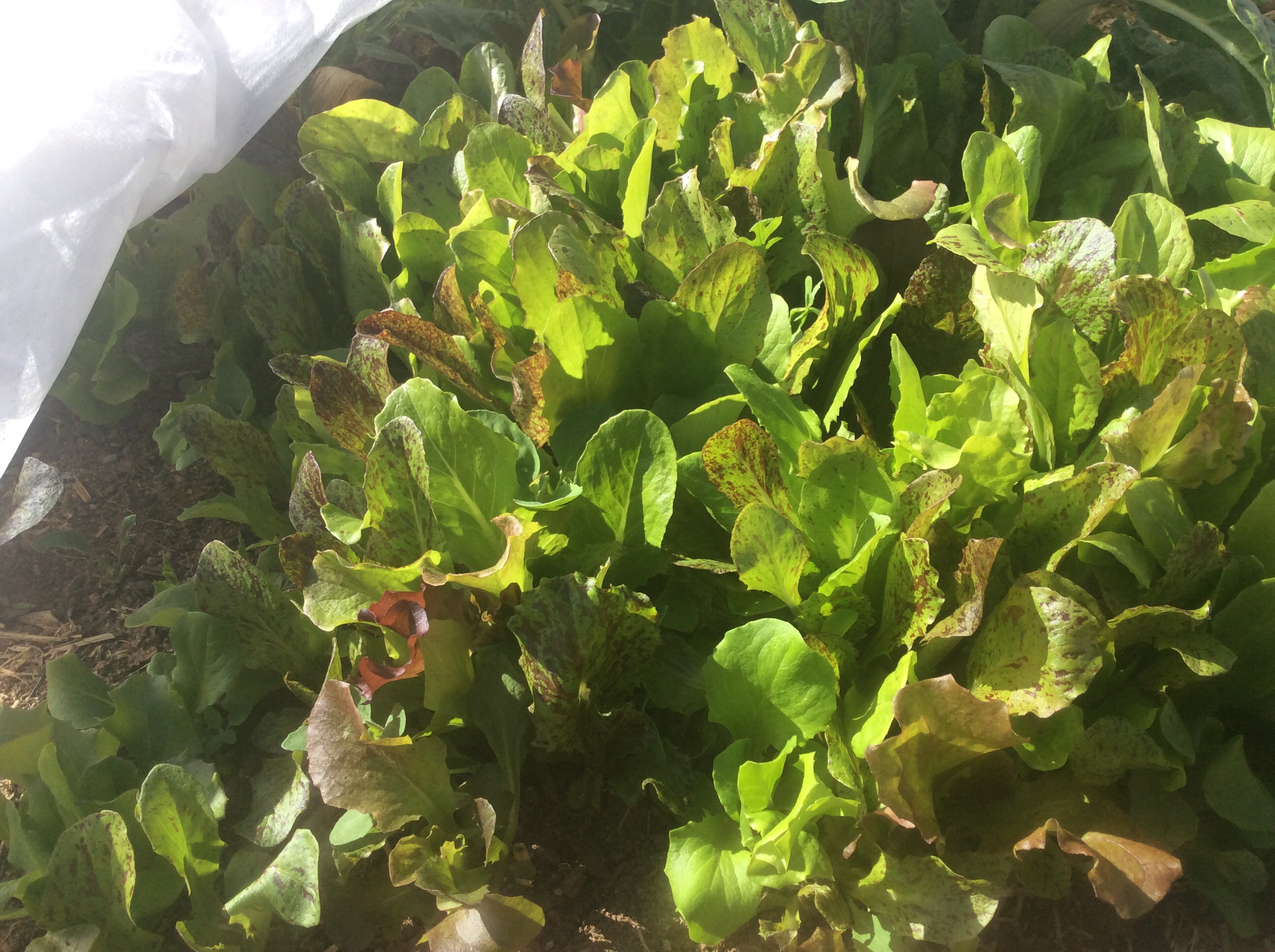 This bed was under the frost-blanket. The little lettuces are over 4 inches high, and harvesting can begin.