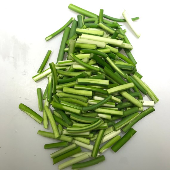 I’ve posted before about garlic scapes, and it occurred to me this spring that I had a little more to say. I see garlic scapes being sold at markets that are large spirals with several loops, and while these are pretty to look at and play with, I personally don’t think of them as edible. Good scapes are young, just a foot or so longer than the garlic plant below, and form 3/4 of a circle or less, as you see above. Snap them off rather than cutting; they should snap like a bean when bent double. Then, snap off the upper blossom sheath, which is quite tough. The stem under it is tough too. The point where an actual snap happens might be 4-5” below the blossom swelling, meaning that of a foot-long scape, you might end up with 7” of good edible portion.