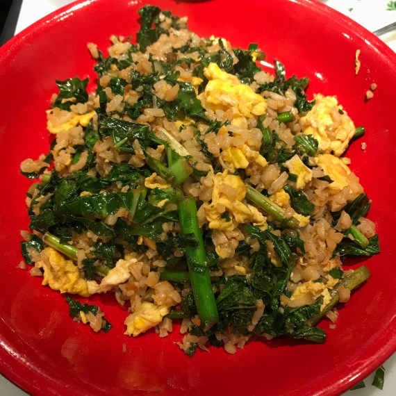 Rather than give a recipe for fried rice, I decided to link to the excellent and infinitely variable Pork Fried Rice recipe on The Woks of Life. This is a terrific blog that I’d like my readers to know about. I will only add that I often make meatless versions and that I think 2-3 teaspoons of oyster sauce is an essential addition to the “sauce” that’s added to the rice as it cooks. The garlic scapes got a couple of minutes in the hot wok by themselves with just oil and soy sauce, then another minute with some finely sliced tender greens from yesterday’s weed post, before the final combining took place, and a good drizzle of Asian sesame oil was added just before serving.