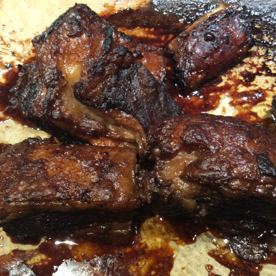 I like to tie the seasonings up in cheesecloth because I find it easier than straining the sauce later. Either way, combine all the sauce ingredients in the liner of a six quart slow cooker and add the short ribs. Cook overnight at low setting. The next day, about 12-14 hours later, drain off the broth and strain it or remove the cheesecloth. Put the broth in the refrigerator so that the fat can congeal. The meat should be falling off the bones. Remove the bones and reserve the meat.