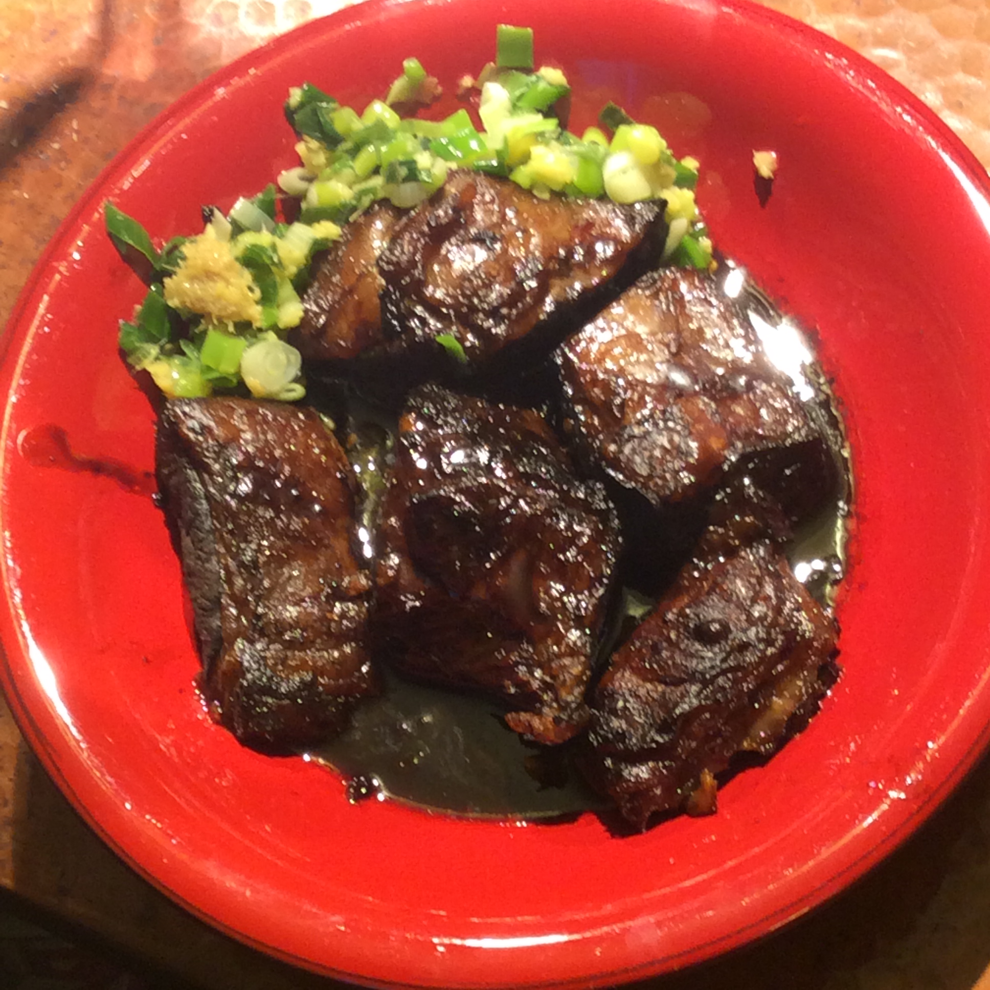 Now taste your reduced broth. Tasting as you are finishing things is an important and surprisingly neglected step. This is the time to think about your food. Is the balance of flavors right? Is there anything else it needs? I like to add another scant teaspoon of five-spice powder and a little chopped ginger at this point to freshen the flavor. Arrange the meat on a roasting pan, fat side up whenever possible, drizzle with some of the sauce, and broil until the fat starts to brown. Watch carefully so it doesn’t burn. When the fat is browned, turn off the broiler and let the meat sit in there another few minutes to make sure it’s good and hot. Place in serving bowls, pour over some more sauce, and put a generous spoonful of ginger-scallion relish on one side. Eat. The cold and wind have no further power to harm you, at least not tonight.