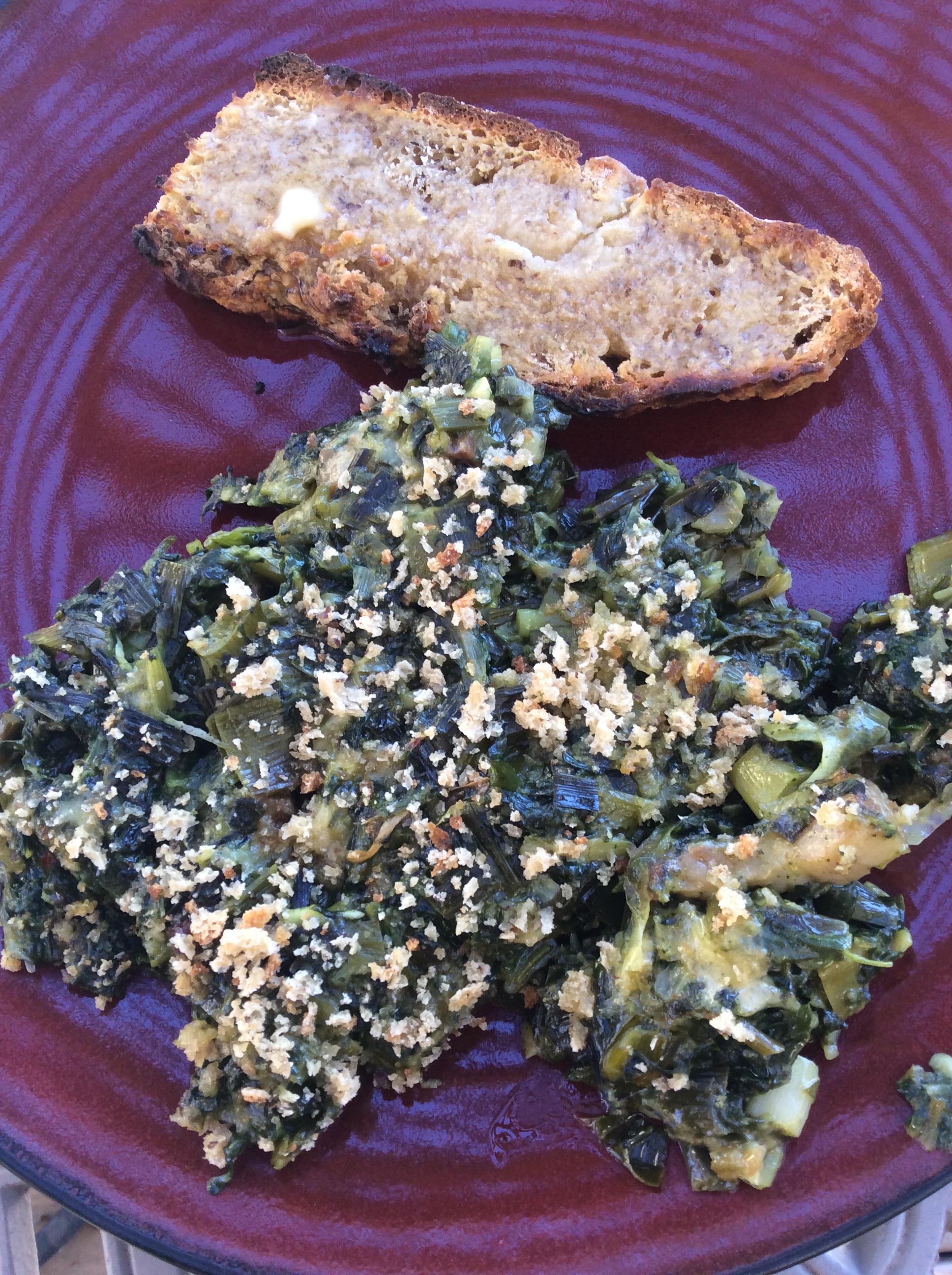 Next came the crust. If you’re used to working with phyllo, this takes less than 5 minutes. Unroll the pastry, brush one sheet at a time with olive oil using a pastry brush, and align them in the baking pan the way you want them. I used am 8×12” pan, but you could also use a square pan or round pan. The filling will be thicker in the smaller pans but the flavor will be the same. Don’t get hung up on details like exact pan size. If you haven’t worked with phyllo before, there is a great tutorial on the wondrous Food 52 site. Just have ready a damp but not wet towel, about half a cup of good olive oil , and a pastry brush. I used about half a package of phyllo.