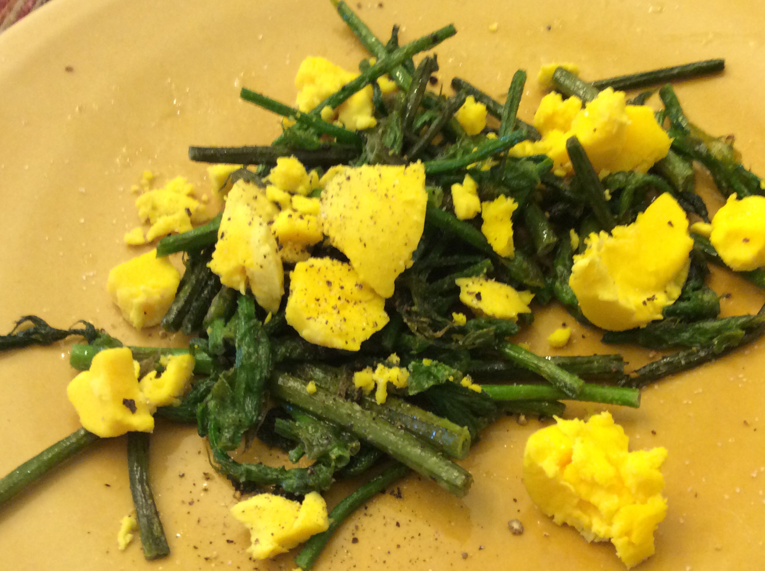 Two posts ago I wrote about learning to use spring hops shoots as a vegetable, and a couple of weeks after my first taste, they are nearly over for the year. I hit a tiny second harvest by breaking off the tips when the vines were as tall as I wanted. These “upper shoots”have even more of the wild, feral, slightly bitter flavor than the first emerging growth has, and are quite addictive. My favorite preparation so far is to cut them into segments about an inch long, sizzle them in butter or olive oil over medium-high Heat until the stems are crisp-tender and the infant leaves are fried crisp, salt to taste, and crumble the yolk of a hard-boiled egg over the top. The egg yolk smoothes the bitterness beautifully. This method works well with bitter greens as well.