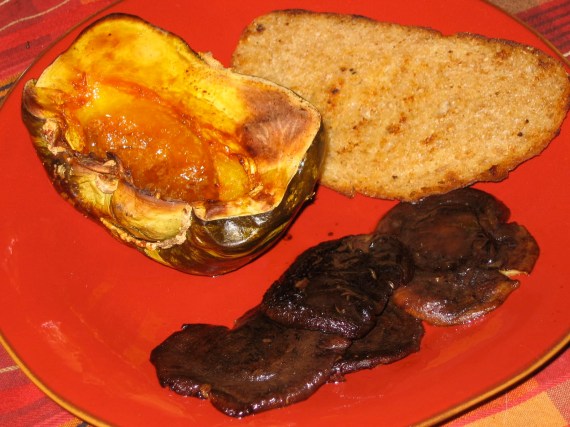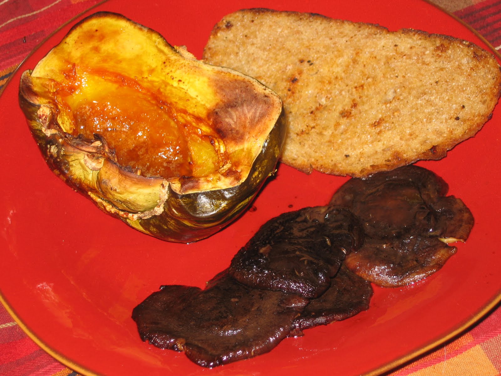 In my opinion, roasting is by far the best way to bring out the flavor of squash. It keeps wonderfully in the refrigerator for a few days once roasted, and can also be mashed, packed tightly into containers, and frozen for later use. Once properly roasted, it can be made into ravioli or lasagna fillings, form the basis of hearty soups, or just be reheated later to eat out of the shell, so I roast plenty at a time. If roasting smaller squash, I cook several, so that the oven heat is efficiently utilized, or I put them on the bottom shelf of the oven when roasting something else. I love to put maple syrup or agave nectar, a pat of butter, and a pinch of salt in the cavity if I will be eating the squash straight, but if I might use it for something else like lasagna or ravioli or one of the impromptu dishes below, I just rub the cut surfaces with olive oil and salt before roasting. In the picture above, a roasted Kukuza half dominates the plate, with a few grilled mushrooms brushed with oil and soy for a meaty touch and a slice of grilled bread with olive oil and garlic. THis is a great substantial meal to share with vegetarians and vegans, or with nearly anyone.