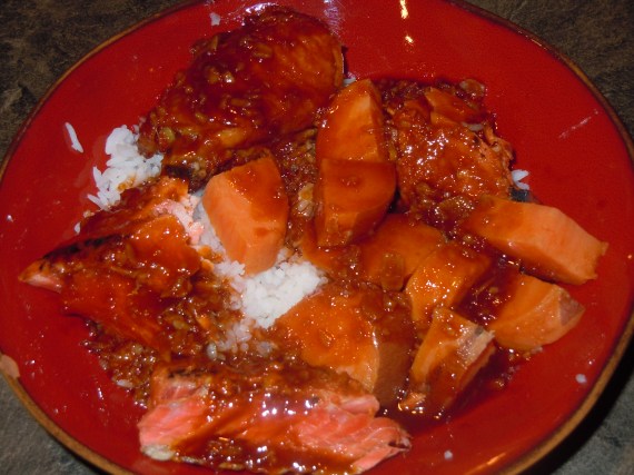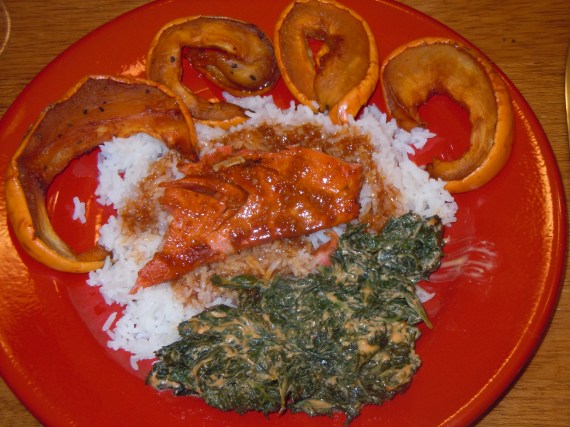 Here chunks of leftover roasted squash join a few chunks of leftover roasted salmon under a cheerfully colored Korean sauce. To make the sauce, chop up 2 cloves of garlic and a 1″ cube of peeled ginger. Heat a couple of tablespoons of oil in a small wok, and when the oil is hot throw in the chopped garlic and chile. As soon as the ginger fragrance comes up, about a minute, put in a tablespoon of gochujang and stir around madly for half a minute, then add half a cup of stock and 2-3 tablespoons of soy sauce. As soon as it comes to a boil, turn off the heat and add a teaspoon of dark sesame oil. Have ready a teaspoon of arrowroot dissolved in a tablespoon of water, and stir in. Let the sauce thicken briefly and serve over a bowl of rice topped with hot chunks of salmon and squash.