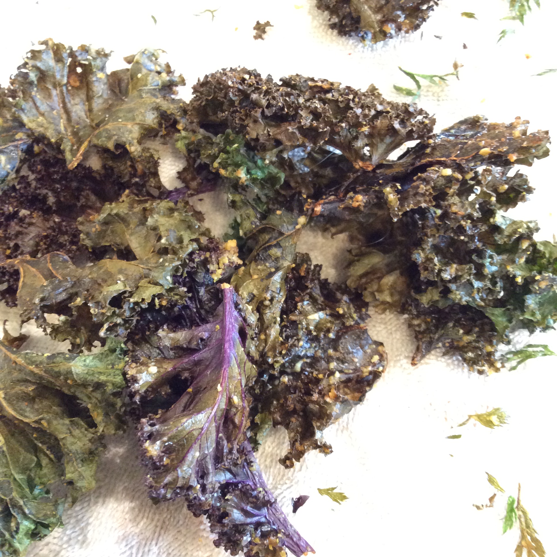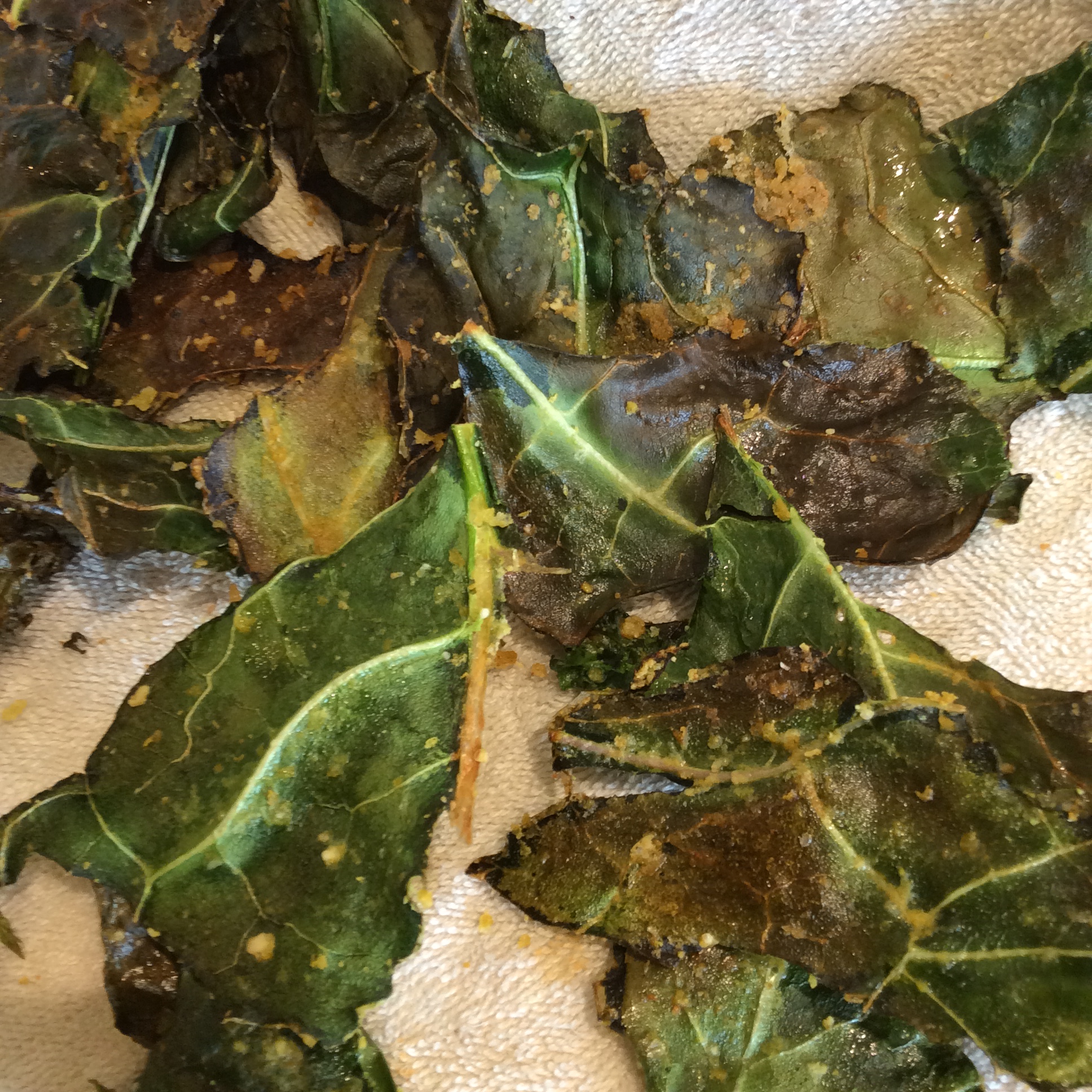 Lesson learned:  don’t put them all on the tray at the same time, no matter how pretty it looks. The three greens finished at very different times.  Collards needed the least time, and despite several experiments I never did get them quite right. They go from olive-green and ready to eat to brown and burnt-tasting  in under a minute. Also, they don’t cook very evenly despite your best efforts, so ultimately what I ended up doing was just picking out the brown leaves, which taste burnt, and throwing them away. I still think there are real possibilities here but I did not get them to work as a satisfactory chip.