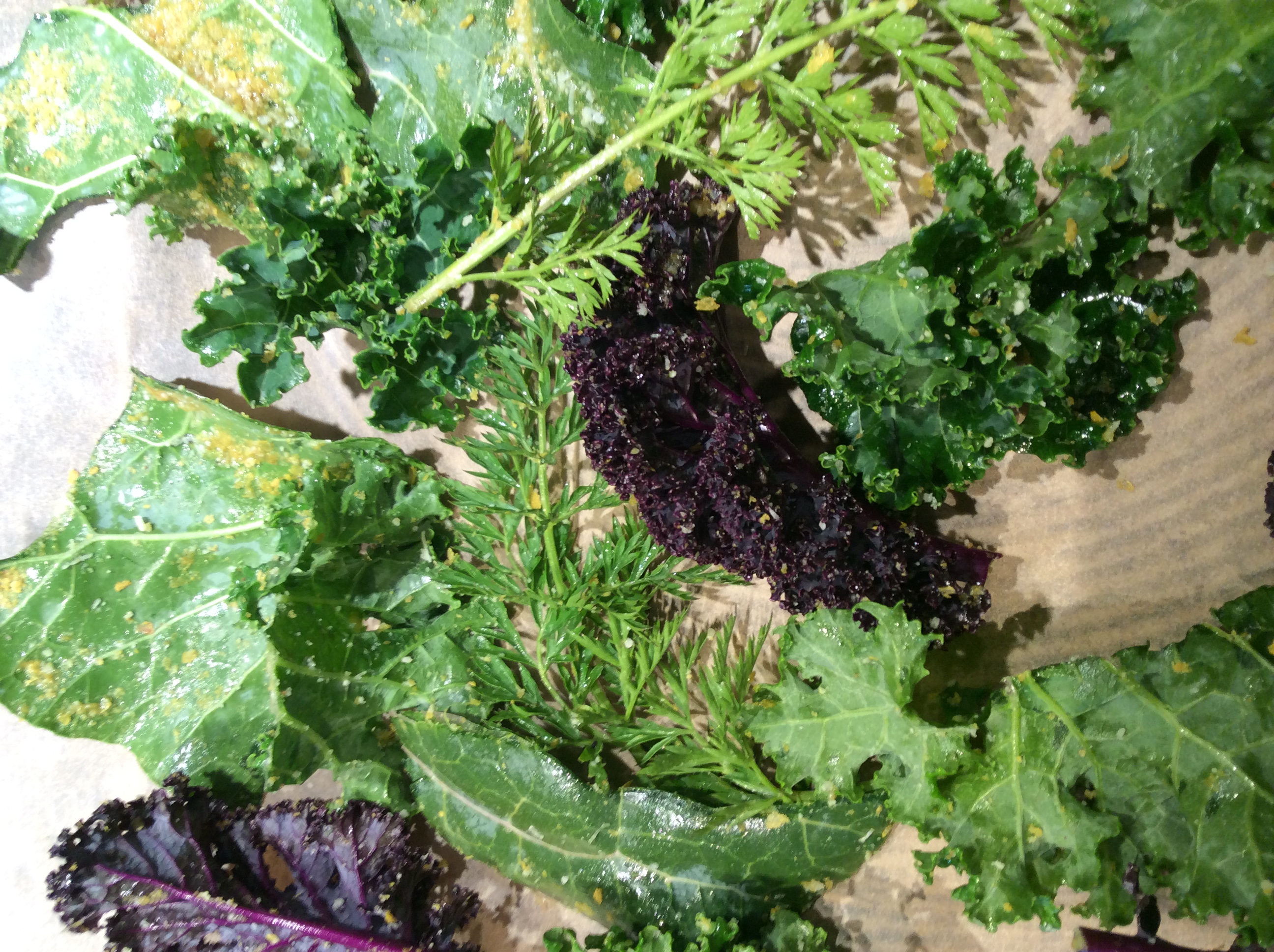 Probably everybody has made kale chips, the delectable snack made by oiling and seasoning pieces of curly kale and baking them at 375 or 400 until they are crisp. They are delicate, and not much good for dipping in anything, but they are quite wonderful by themselves. Recently I was making a batch and began to wonder about using some of my other available greens. Ultimately I used both green and scarlet curly kale,  carrot leaves, and torn sections of collard leaf because that was what was left in the garden.  The leaves were washed, allowed to drain, and 12 mid ribs removed from the larger leaves. In the case of the small carrot leaves, the stem was snapped off just below the lowest leaflet. I drizzle them with olive oil and seasoned with salt, finally grated Parmesan, nutritional yeast flakes, and a sprinkling of roasted ground garlic. If you want an exact recipe, there are dozens on the Internet. This is something you can do in a very improvisational way as long as you don’t oversalt.