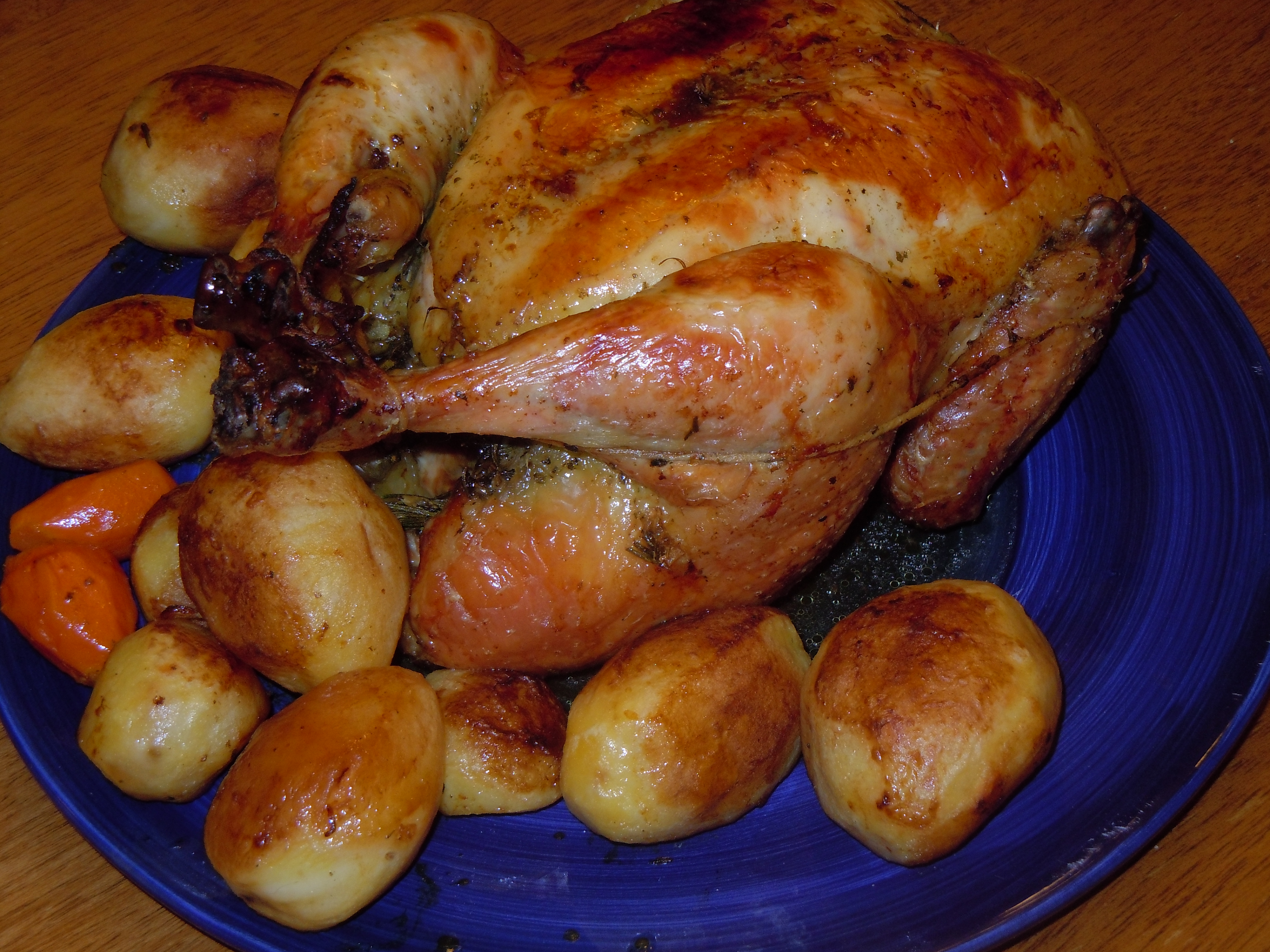The days are short now, cold nights make a warm stove welcome, and there are longer evenings in which to do my culinary experimenting. Sometimes I like to try unknown ingredients and cuisines that are new to me, and sometimes I like to try slight twists on familiar favorites. Right now I have an abundance of good chicken raised in my own yard, and a simple roast chicken is great when it has real chicken flavor. These birds are big (the one we ate for Thanksgiving had a dressed weight of 14 pounds) and they look quite impressive roasted, but of course a smaller chicken is fine as long as it was raised properly and tastes like a real chicken. Here I followed my usual MO for roasting a chicken (see my post on roast chicken) with a couple of changes.