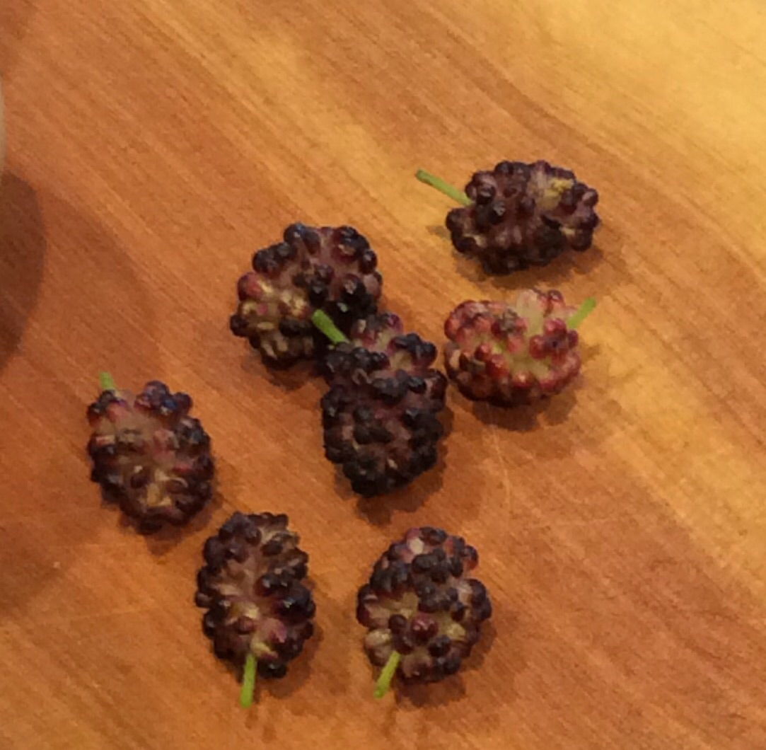 Mulberry can be kept tightly pruned or coppiced for an excellent harvest of small tender young leaves and shootsat the twig tips. Don’t try the leathery older leaves, and stems should be tender enough to easily nip off with your thumbnail. It matters which mulberry you get, since some have perfectly good leaves and some are awful. I surreptitiously tasted at the organic nursery where I bought mine, to get leaves that had no unusual toughness or off flavors. Mulberries have a good amount of resveratrol, but I have no idea about the resveratrol content of the leaves. I would guess, however, that it’s probably in there. Once you have a mulberry tree you have it forever, and the only problem is keeping it pruned tightly enough that you can reach the leaf tips. I recently learned from Samuel Thayer‘s newest book that the flowers can also be eaten in salads. I will be trying this next spring. If you have a yard goat, goats adore mulberry branches above almost anything else, and will happily eat up your prunings. There are some wild food books that claim that the leaves are hallucinogenic, and others that say the leaves are not hallucinogenic but the water in which they are cooked is. I call nonsense on all of this. Young tender mulberry leaves are one of my favorite greens, and I eat a lot of them, and drink the water that they were cooked in, and nothing remotely interesting has ever happened as a result. Mulberry leaf tea is also widely used in Asian and given to children and old people, with absolutely no concerns. I don’t know where this stuff comes from. I am happy to say that Samuel Thayer, a profound expert on wild foods if ever there was one, talks about culinary use of the leaves and does not mention this at all. A tightly pruned or coppiced mulberry can be kept in any front yard, since if you keep cutting it back it doesn’t bloom, and after the first few years will provide a surprising amount of greens.