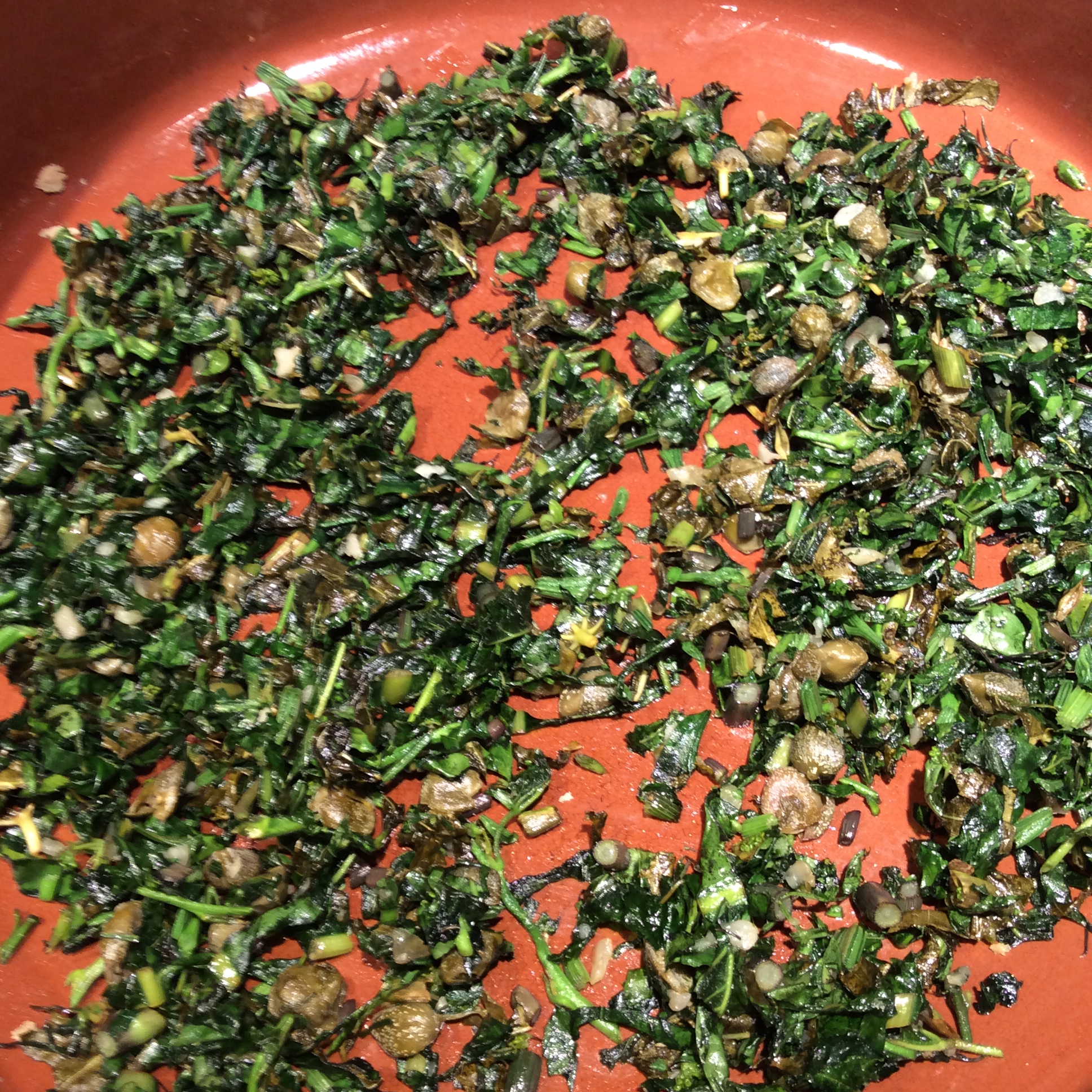 Hops were planted all along my fences back when I used to brew beer. I don’t brew very much anymore, but hops shoots are a lovely wild-bitter tasty treat that I look forward to every spring. I am convinced that fancy preparation is a bad idea. Just rinse them, chop a bunch of them in 1 inch lengths, and fry quickly in olive oil with a generous pinch of salt. Nothing else. Be sure to let them form some browned crispy areas so they can taste their best.